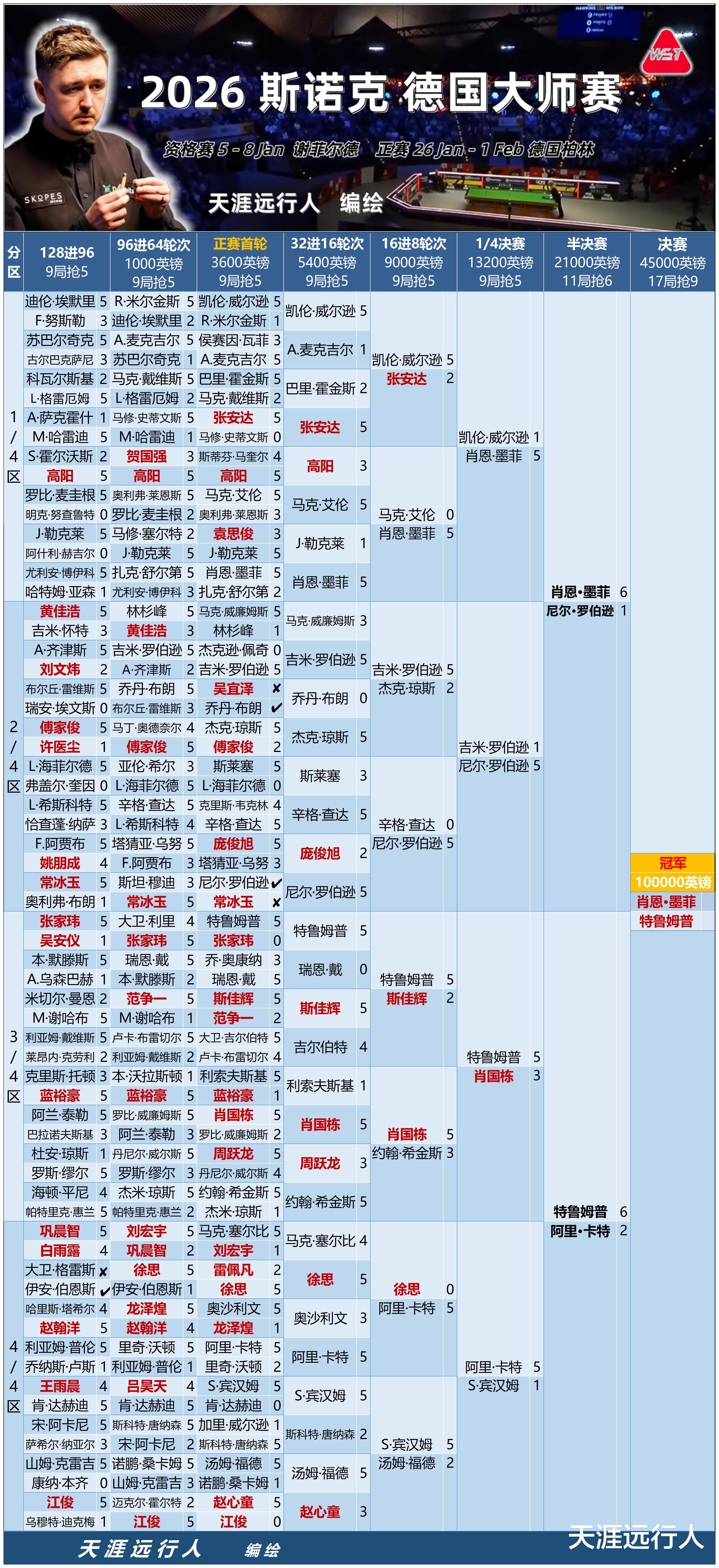 最新即时更新2026斯诺克德国大师赛进程签表,一表看德国大师赛全程,各位看官老师敬请转发收藏,以备不时之需