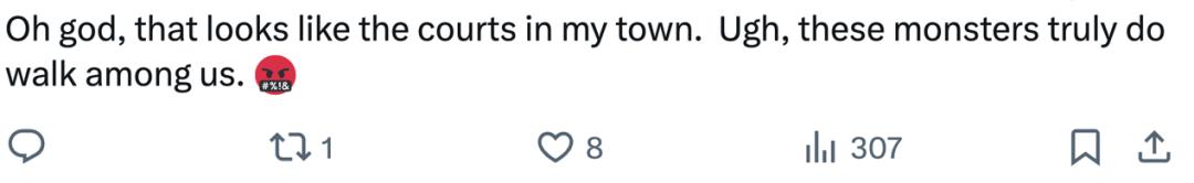 “天,法院看着像我家这边的。呃,恶魔真生活在我们之中!”