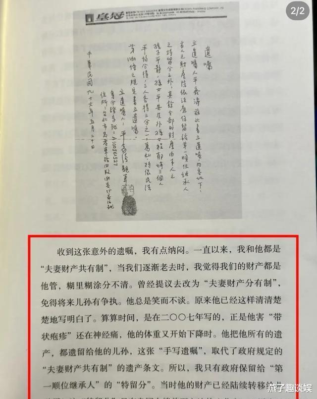 琼瑶阿姨坦言,平鑫涛一生筹谋,却终成空。他在遗嘱中将珍视的皇冠杂志社赠予子女,而留给琼瑶的,仅有居所可园。