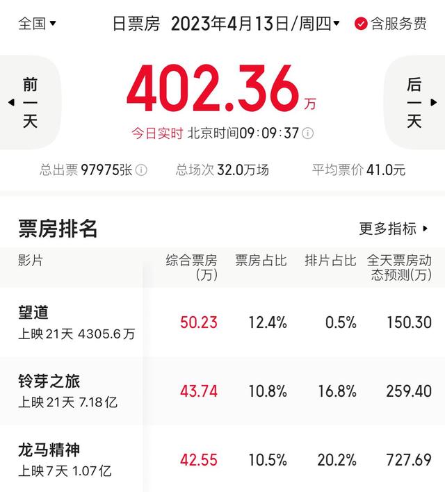 截止4月13日上午9点,《望道》暂时名列当日的票房冠军,虽然还不是今天的最终票房排名,但能够从前一天的票房第8翻到今天暂时的第1,已经是相当可以了!