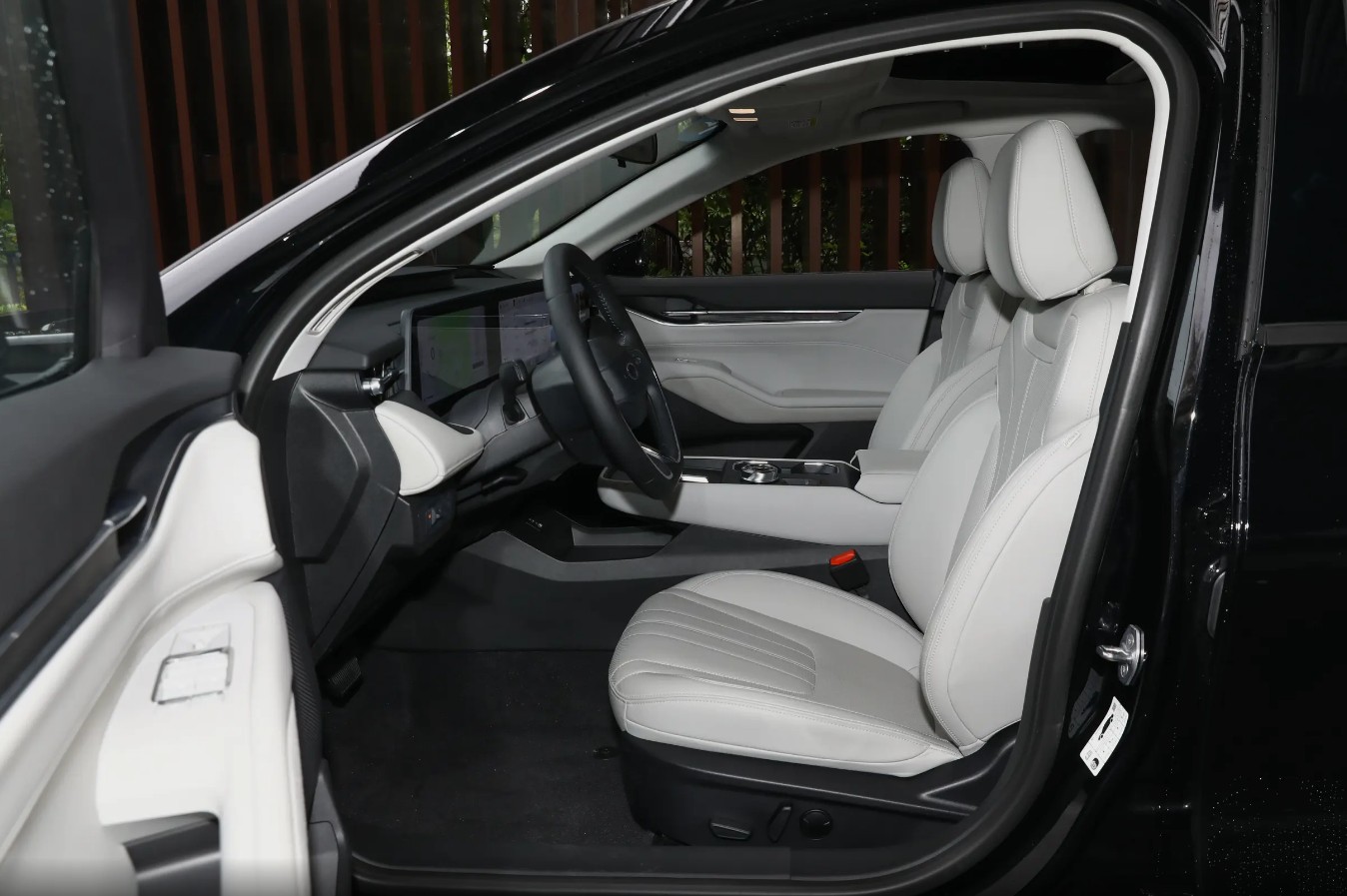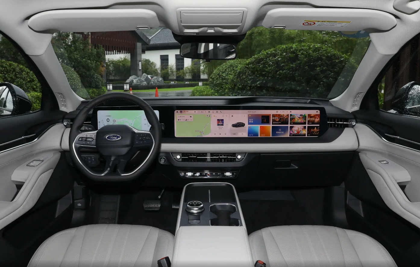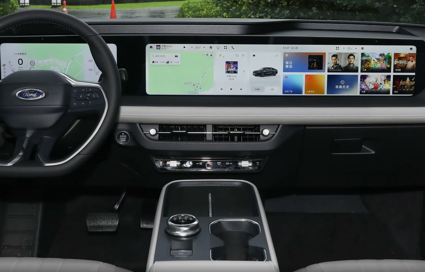 内饰更是惊喜。环抱式座舱灵感源自航空机翼,中央扶手区采用游艇悬浮设计,配合大面积软质包覆,触感细腻。最抢眼的当然是那块1.1米贯穿式27英寸4K巨屏+12.3英寸液晶仪表,几乎覆盖整个中控台,科技感拉满却不显杂乱。值得一提的是,福特这次回归了空调和音量实体按键——在“去物理按键”成风的当下,这种兼顾盲操安全与操作效率的设计,反而显得格外务实。