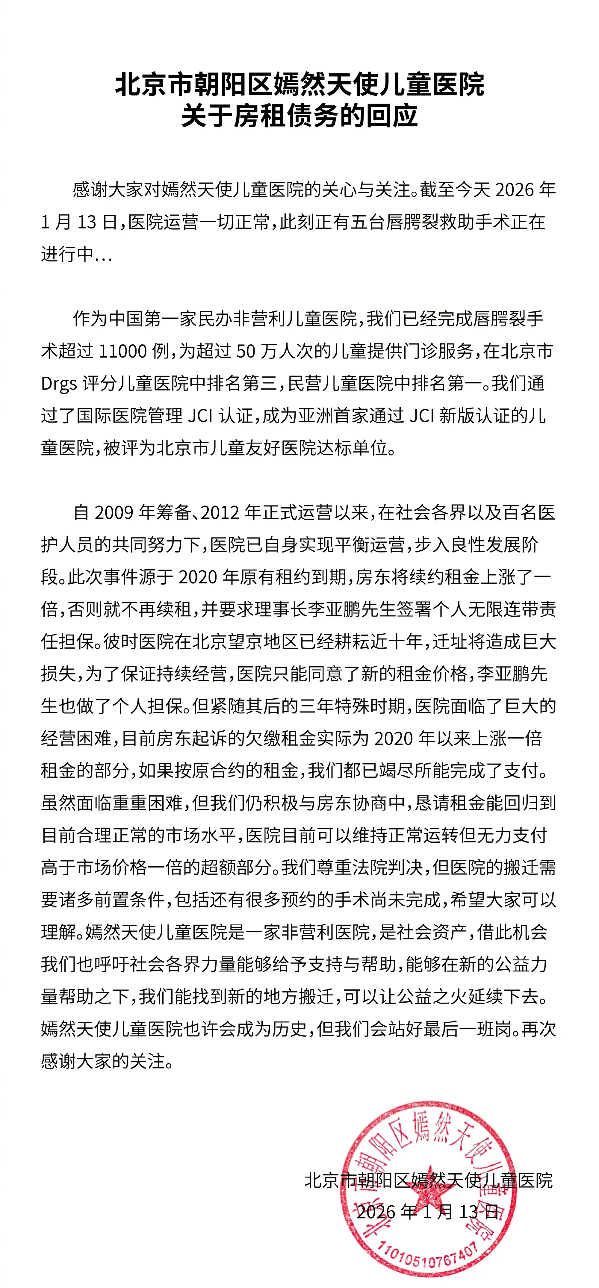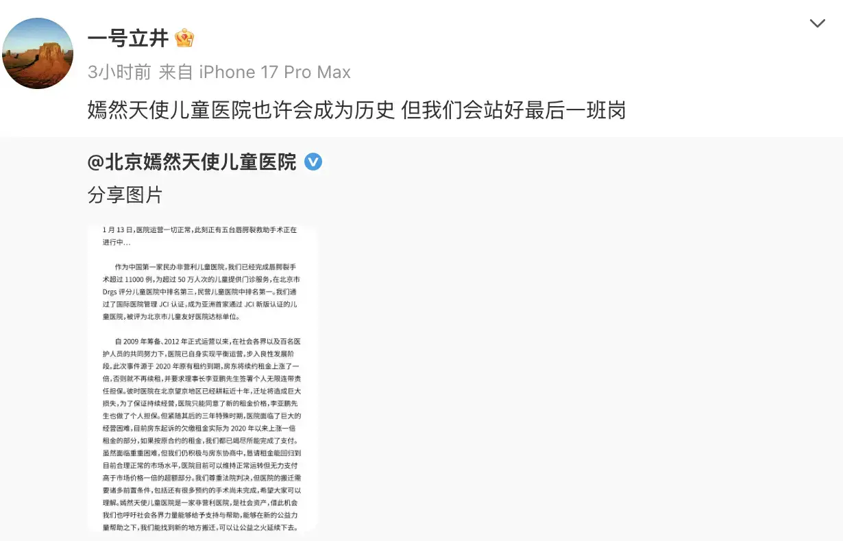 1月13日,医院官方发布回应,详细说明欠租争议焦点,随后其法人李亚鹏转发该内容,一句“嫣然天使儿童医院也许会成为历史,但我们会站好最后一班岗”,道尽了坚守与遗憾。这场横跨四年的纠纷、累计2600余万元的欠款,以及李亚鹏的孤勇坚守,引发全网对公益与现实困境的深度探讨。