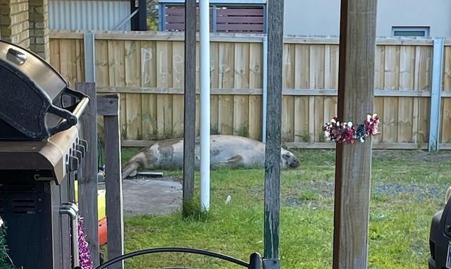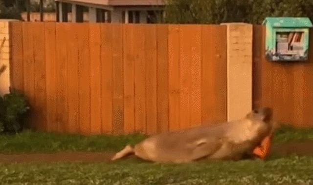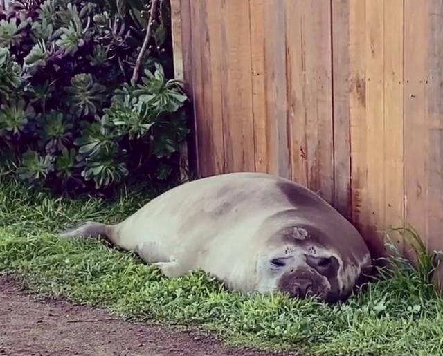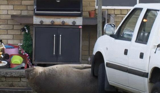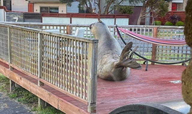 安布尔说,自己早上6点20分起床后,就看到这只名叫尼尔的象海豹在她家前门廊逛来逛去,还探头探脑地往她家里看。