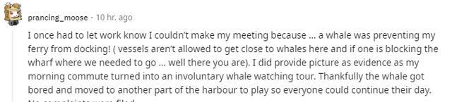 我之前被迫打电话请假,因为一头鲸鱼挡住了我,不让我乘坐的渡轮停靠。