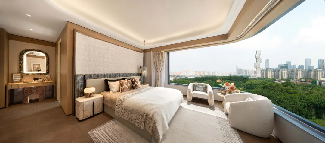 豪宅好不好,先看主人住得好不好。在主卧的设计上,招商佛山序的“天空宫殿”实现了革命性的突破。如今,市面上全L型采光面的主卧并不少见,但是能做到环幕级沉浸式观景的,还得是招商佛山序的全景舱光幕极享主卧。它的出现,让景观不再是客厅的专属,而是渗透到日常起居的每个角落。