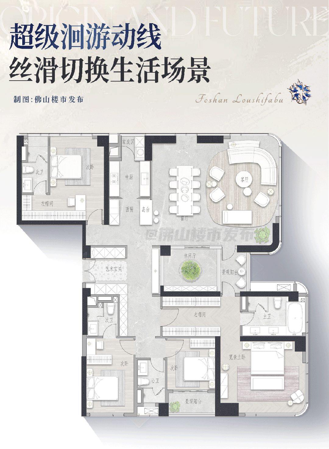 可以看到,改造后的户型是能够满足佛山塔尖圈层的顶级城市居住需求和顶级私域社交需求。层层拆解来看,这个户型的一层更像是一座私人会所,LDKG一体化的超级大方厅设计,平时商务接待或开艺术沙龙,完全撑得起场面。二层的尺度更是突破想象,他将原本的全景舱会客厅与次卧拉通,得到一个超100平的超级奢华主卧,实现极致的隐秘与奢华。双开门入户、U型采光观江面、专属景观休闲区、连主卧都相当于大平层的LDK大方厅……这都是传统豪宅里看不到的,更不是一个时代的产物。而这种随心所欲的定制能力,是建立在开发商对高端生活方式的深度理解之上的,如果没有足够的高端客群样本,是很难与客户对话共创,这就是招商蛇口的底气。
