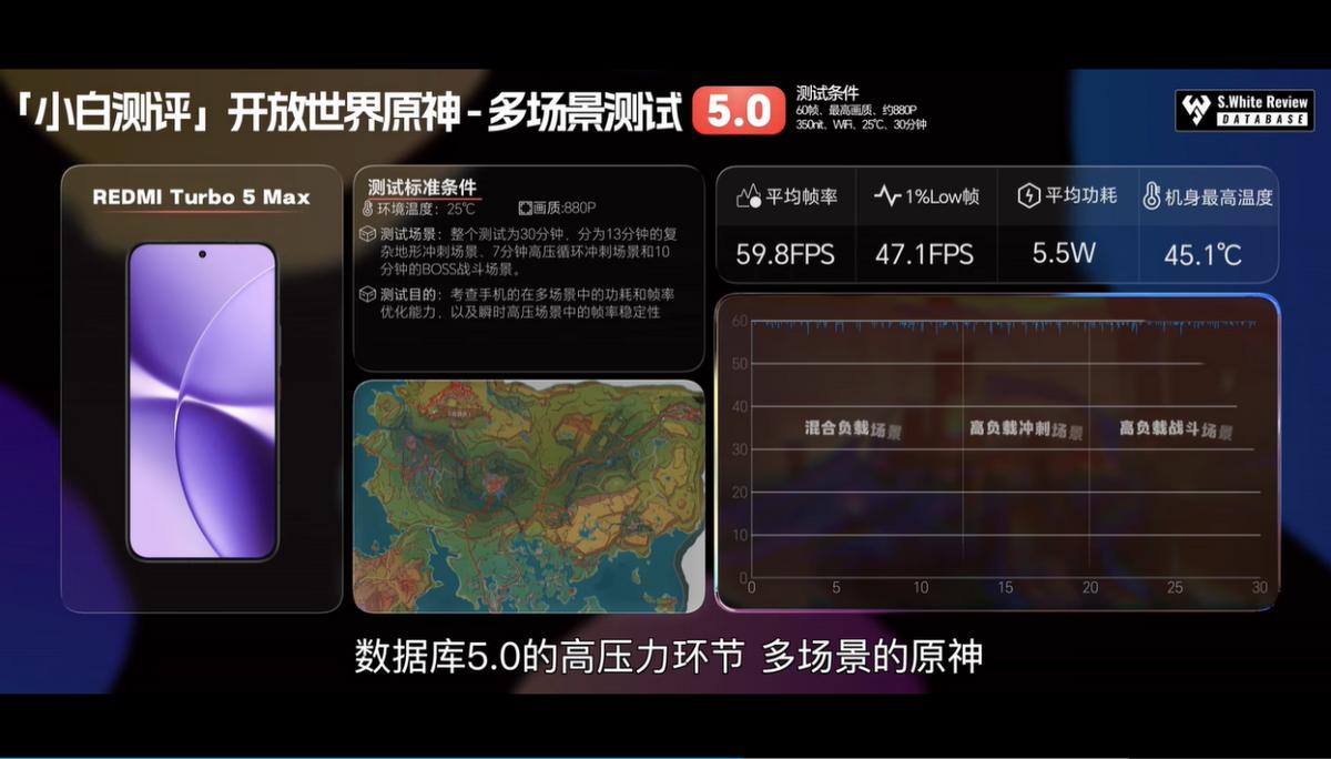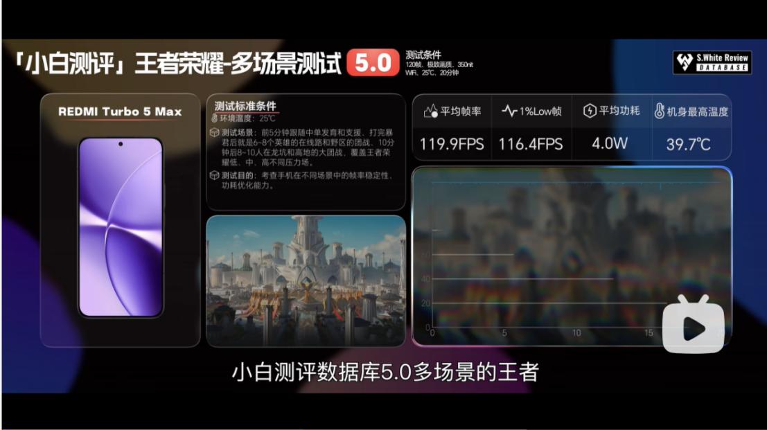 在极客湾的评测当中,天玑9500s基本是骁龙8 Elite处于一个水准的产品。在他的实测中,搭载天玑9500s的红米Turbo 5 MAX在玩极高画质的《崩坏:星穹铁道》时,运行30分钟,平均帧和1% low帧达到了59.4帧和 29.1帧,竞品旗舰只有 48 帧和 28.2 帧,可以说9500s 在3A手游的高帧稳帧能力非常突出。小白测评轻、中、重载场景跑王者、和平精英和原神多个游戏,也得出了差不多的评价——在重载手游《原神》最高画质下,30分钟内都保持了稳稳满帧的59.8平均帧水平。轻载手游如王者、和平则是轻松跑到接近120帧(119.9、119.8)的平均帧率,同时功耗只有4W、4.5W,只能说低频能效下的发哥,是那个永远的神。