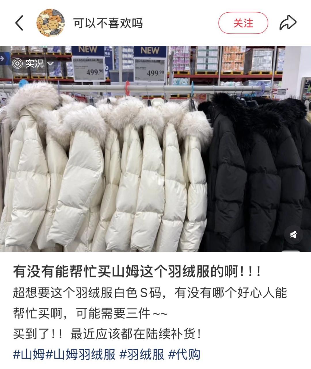 专门做山姆代购的君君告诉有意思报告,所有款式的羽绒服中,最受欢迎的是499元鸭绒白色款S码,即使是在天气相对温暖的广东,也已经断货一个月了。“但恰恰这个最受欢迎的颜色和码数,货源最少,我工作日几乎每隔一天就去看一次,也没蹲到。”君君说。