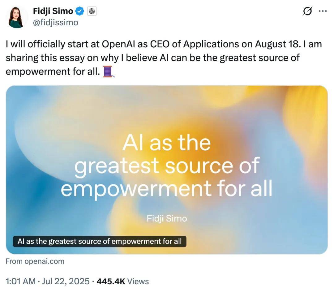 去年 7 月,即将成为 OpenAI 史上首位应用 CEO 的 Fidji Simo 发表了一篇文章,主题为《AI:赋能所有人的终极源泉》(AI as the greatest source of empowerment for all)。这篇刷屏的就职檄文再一次让「AI 全民可用」成为热议的焦点。