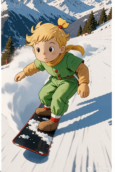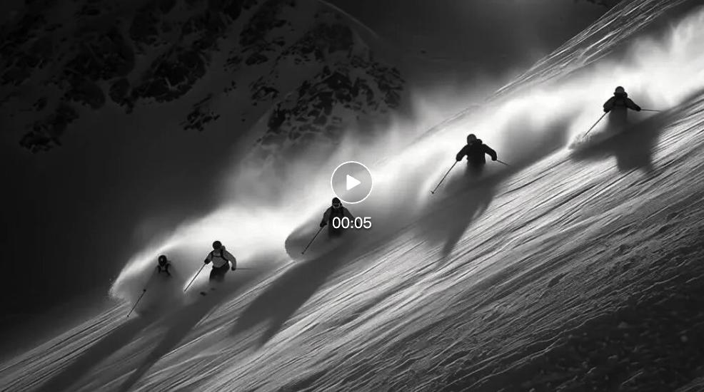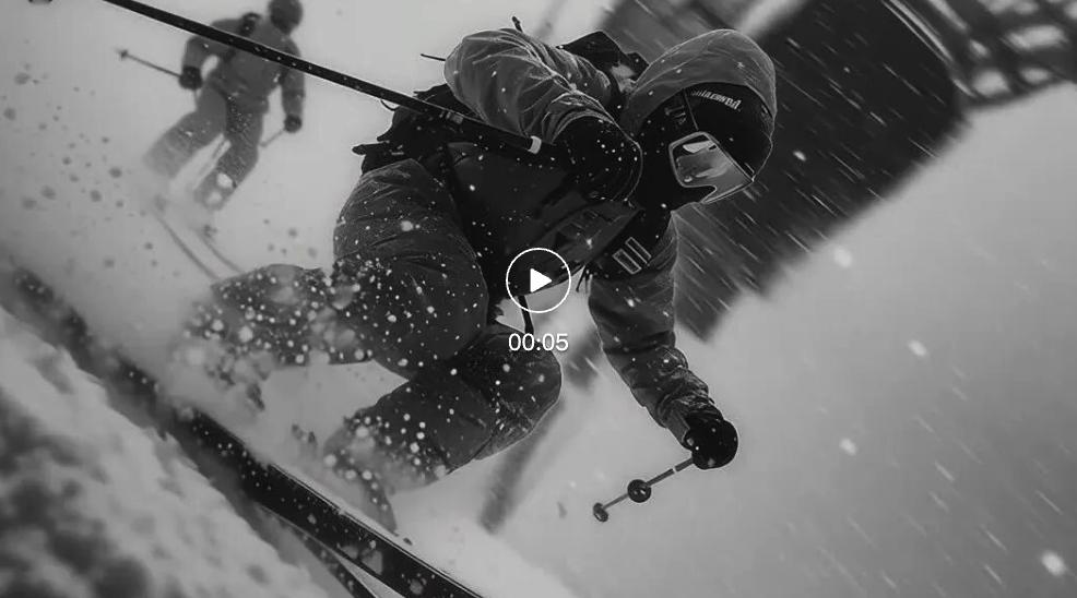 与此同时,Wan2.6 在动态表现和视觉冲击力上同样可圈可点。在这一示例中,镜头贴近雪面,紧跟雪板高速前行,低机位带来的速度感与冲击力被充分放大。