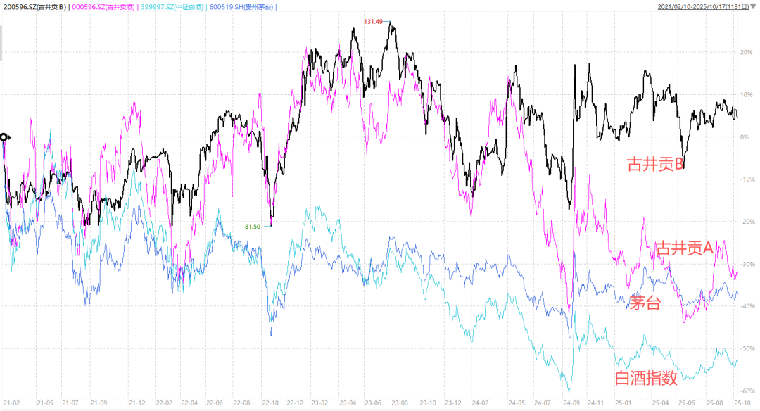从2021年2月白酒的最高点算起,古井贡B和其他白酒的走势如下图。