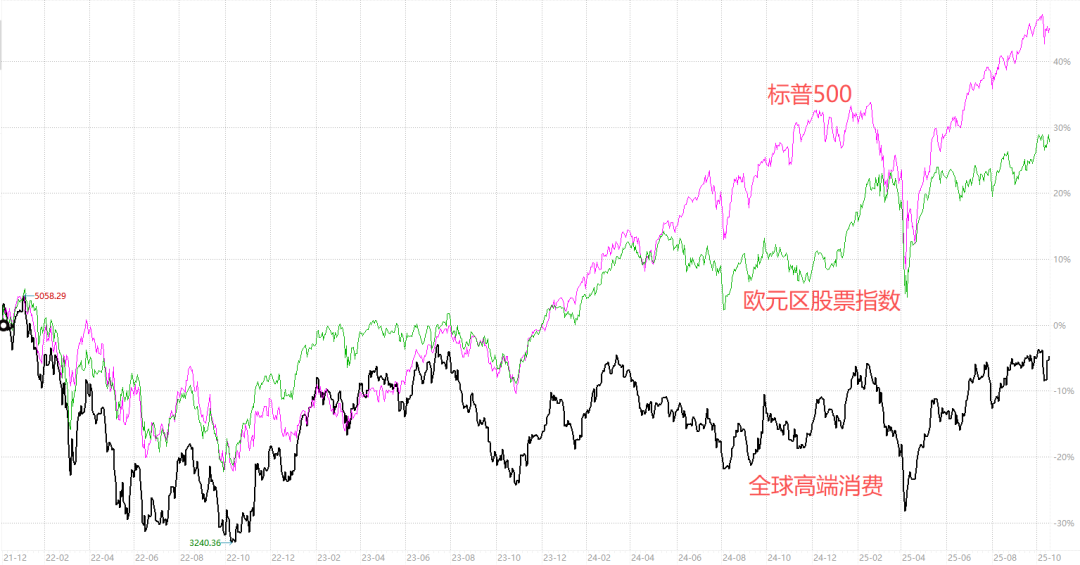 2021年以来,全球高端消费品指数(主要是美股和欧股公司,下图黑线)也明显跑输标普500和欧洲区股票指数(下图紫线和绿线)。