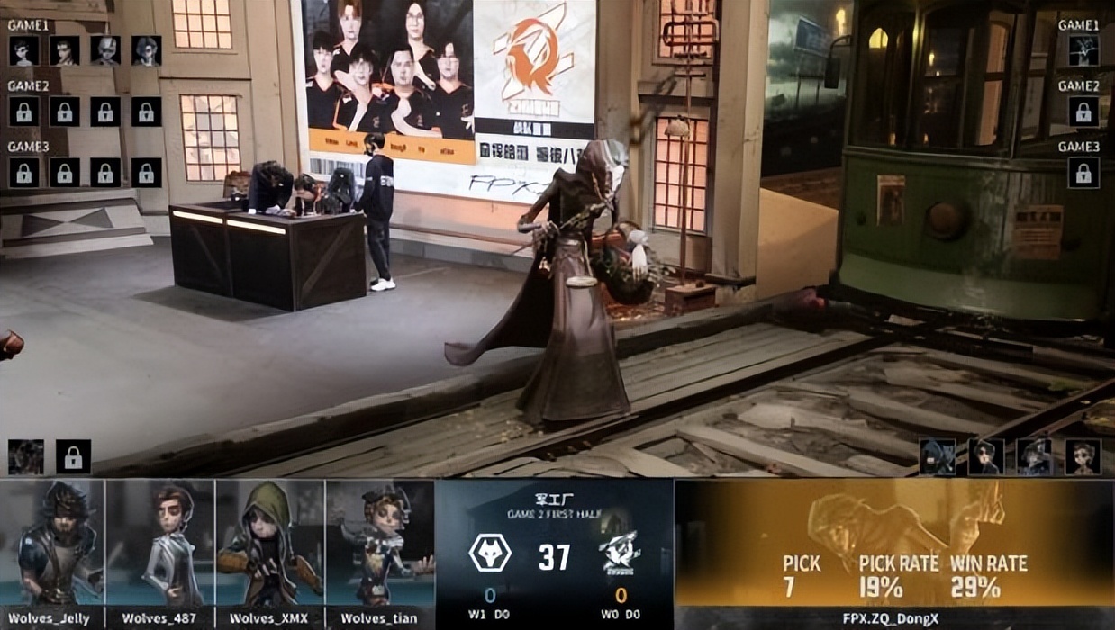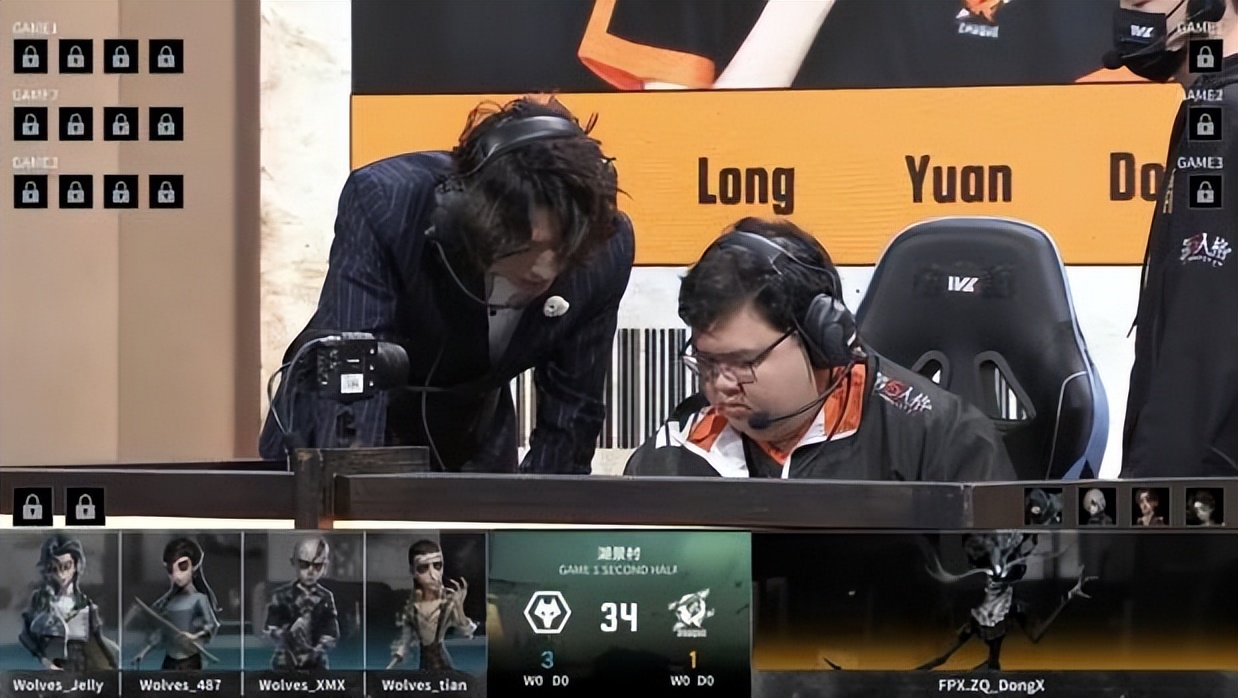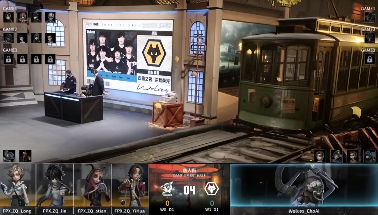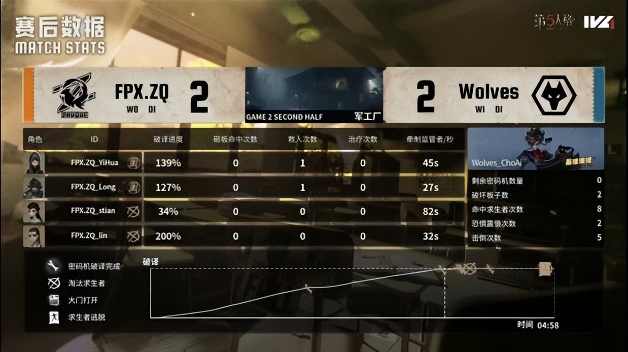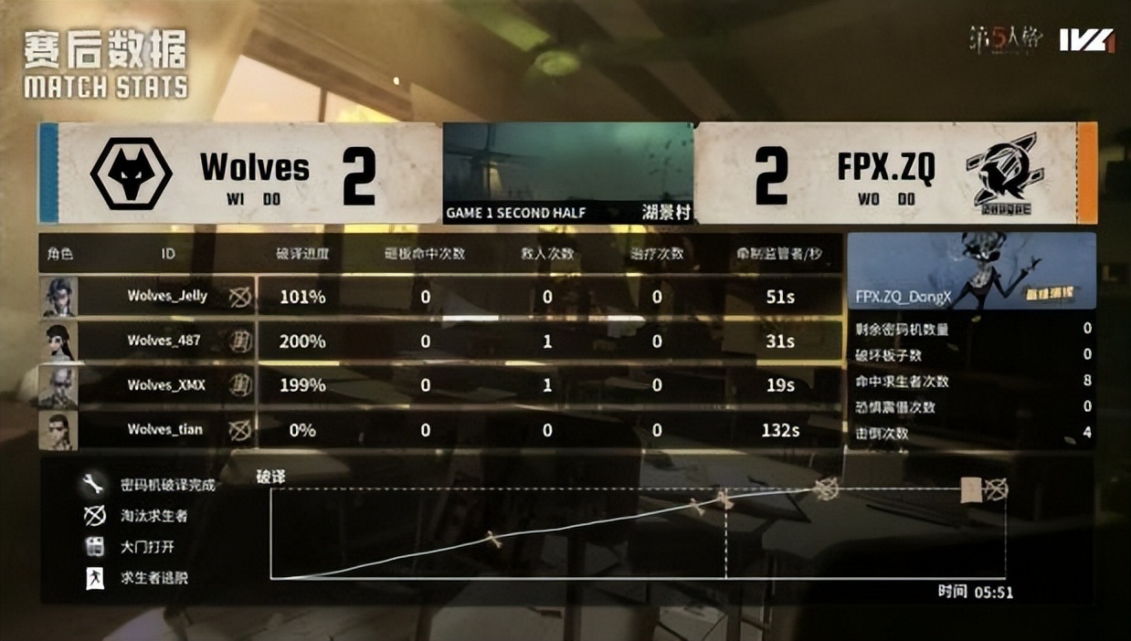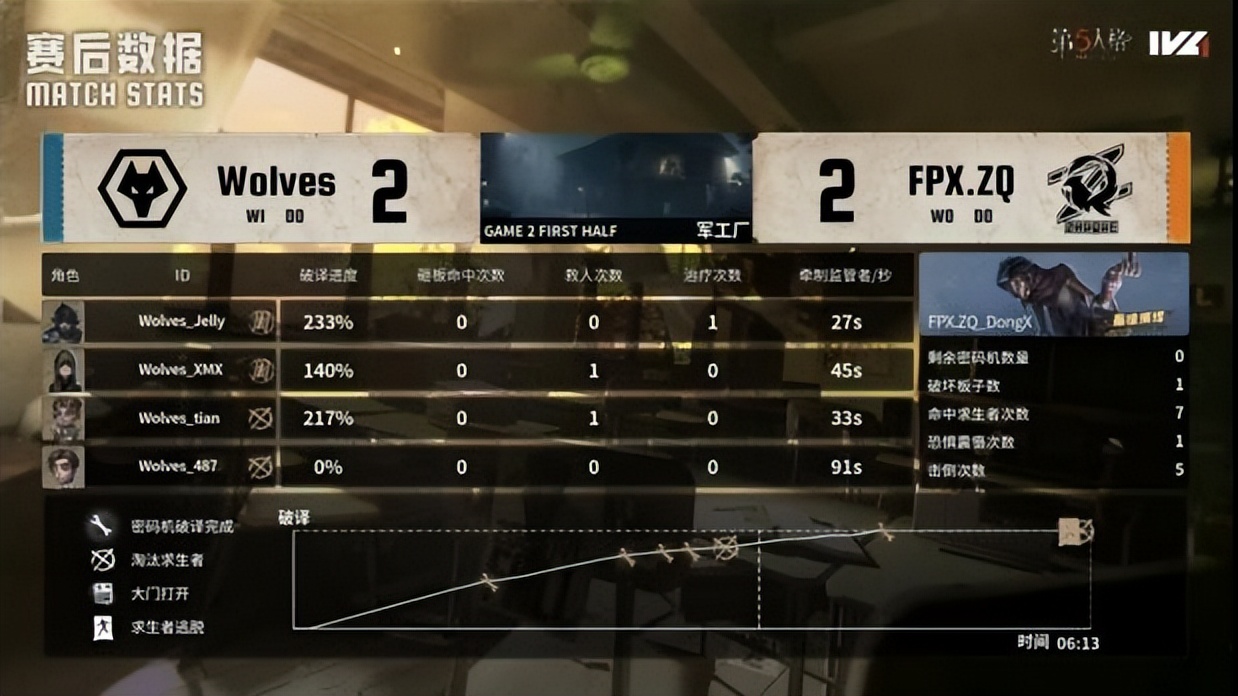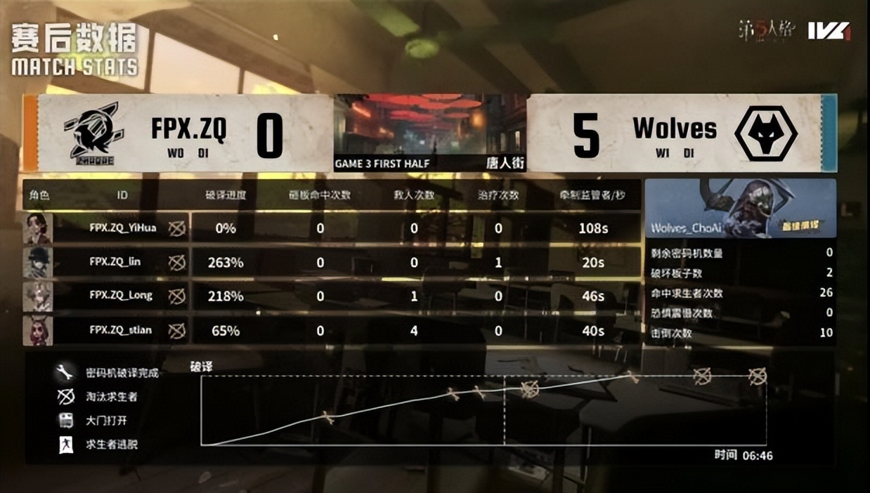 FPX.ZQ的求生者选择了气象学家、病患、祭司、大副(BAN“喧嚣”、小丑);成都Wolves的监管者ChoAi选择了破轮。(BAN小说家、火灾调查员、空军、先知)