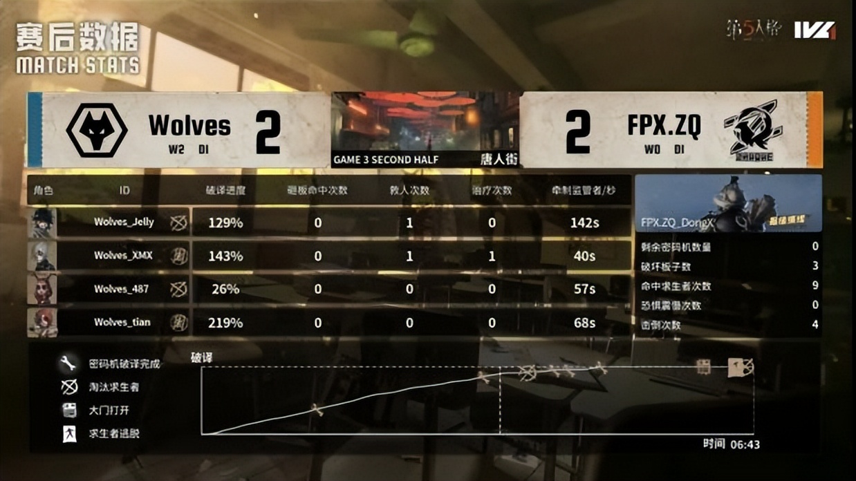 成都Wolves的求生者选择了“骑士”、古董商、教授、“逃脱大师”;FPX.ZQ的监管者DongX选择了时空之影。(BAN先知、守墓人、大副、木偶师)