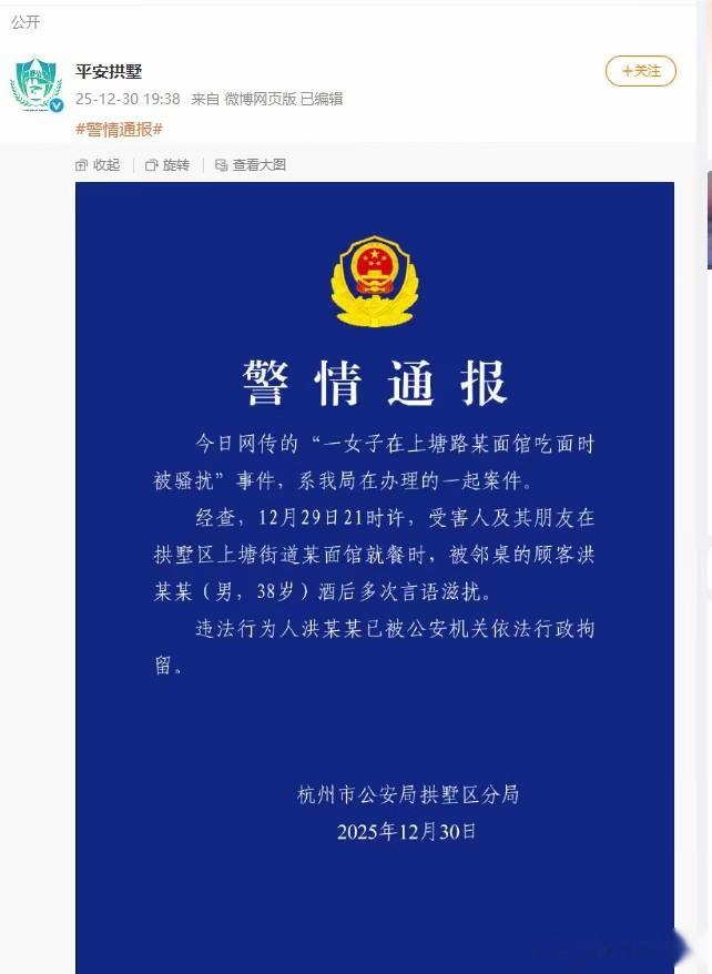 事发后,杭州拱墅区上塘派出所受理此案,将38岁嫌疑人洪某某带回派出所,并依法对他行政拘留。