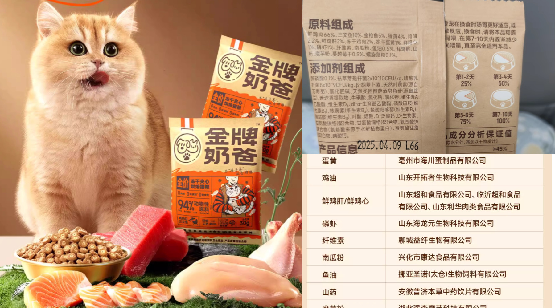 金牌奶爸是由山东汉欧代工的品牌,主做“高肉高蛋白”,瞄准的是看重猫咪营养的宠主,线上主要宣传原料新鲜度。金牌奶爸猫粮怎么样?它的产品线挺杂,不光有全价冻干夹心烘焙粮、猫用主食餐盒,还涵盖了冻干生骨肉犬粮、宠物零食冻干、湿粮猫罐头,甚至连猫砂都有,覆盖了猫狗主粮、零食和基础用品多个品类。营养方面,蛋白质45%、脂肪20%,数据上中规中矩。