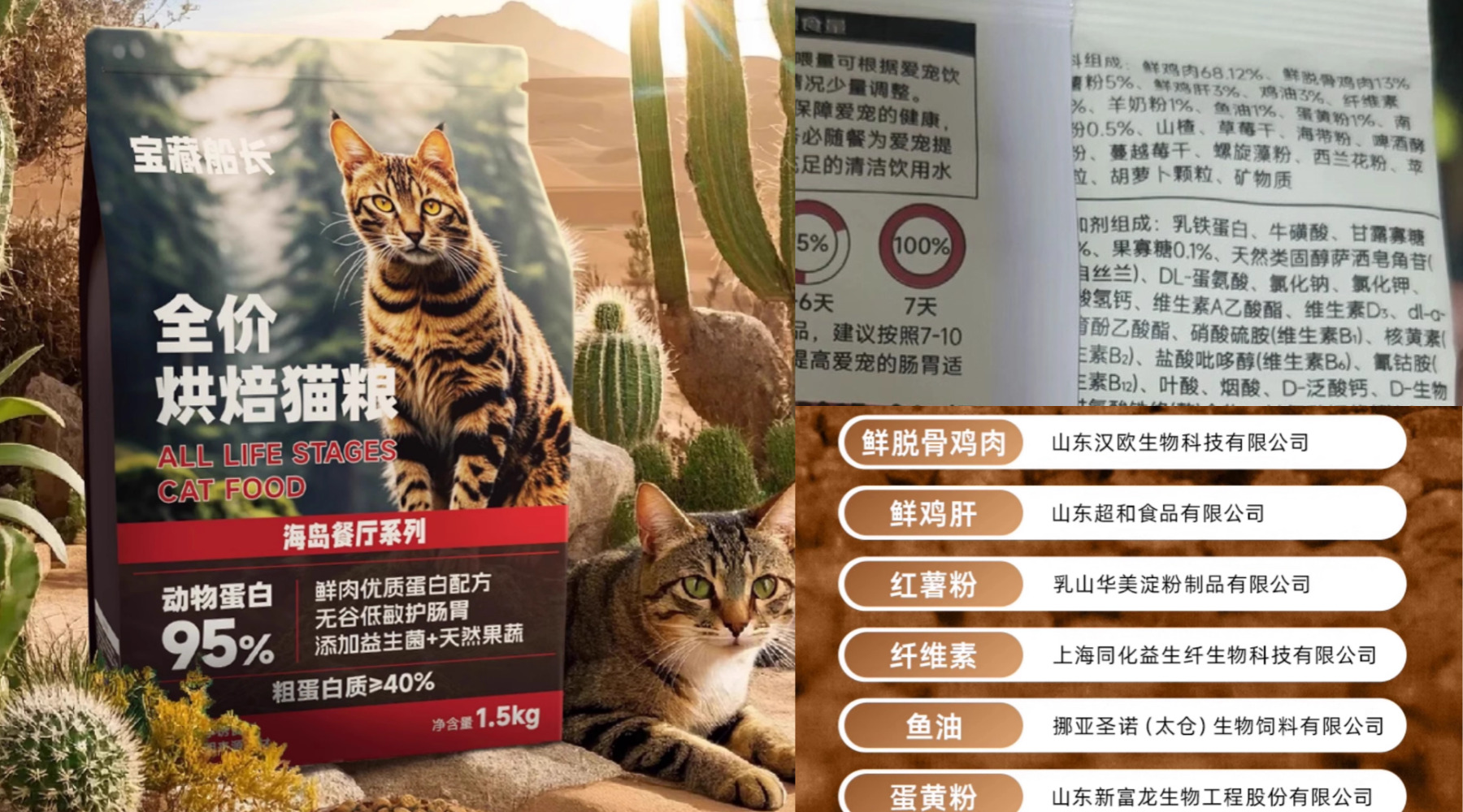 宝藏船长主打高鲜肉配方,依托山东汉欧生产,汉欧是知名代工厂,给品牌添了些底气。它以“食材本味+科学配比”为核心。鲜鸡肉占68.12%,鲜脱骨鸡肉、鸡肝等能查到溯源,来自山东超和、利华等肉企,透明度还算可以。宝藏船长猫粮怎么样?生产流程由汉欧负责,比较规范。配料里红薯粉占5%,碳水控制得还行,没有谷物添加。蛋白质40%、脂肪16%都达标,动物蛋白足够。就是价格不低,预算充足的铲屎官可以考虑。