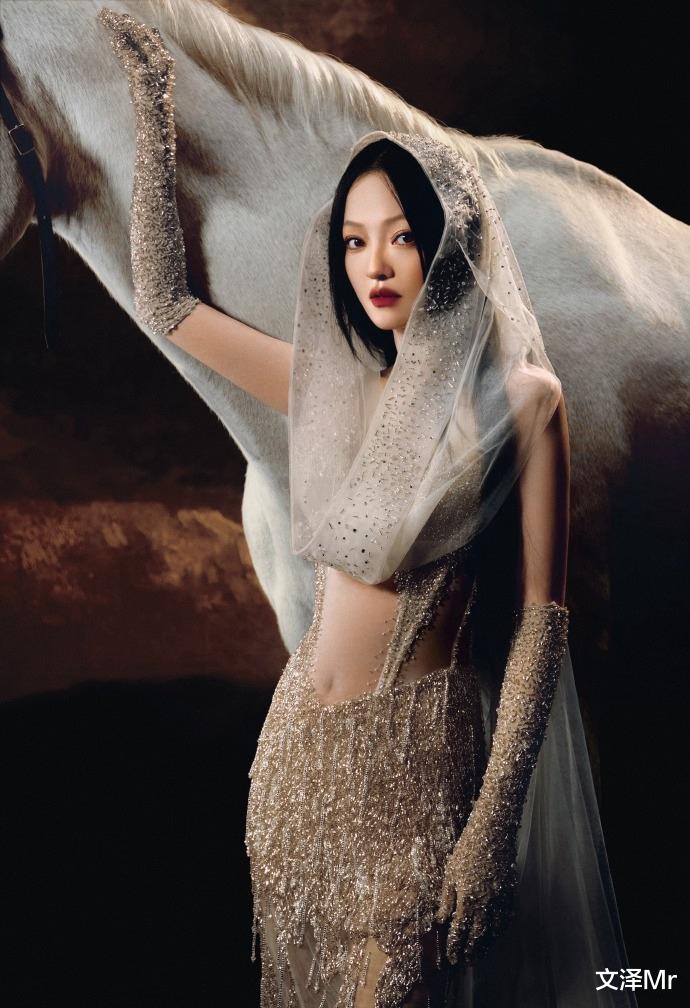 身着一袭华丽的香槟色礼服,头戴缀满亮片的薄纱头饰,优雅地扶着一匹白马。深沉色调的背景与闪亮的服装形成鲜明对比,营造出梦幻而高贵的氛围。每一个细节都与她的表演相融合,共同讲述一个动人的故事。这也反映了她对工作的专注和追求完美的态度。