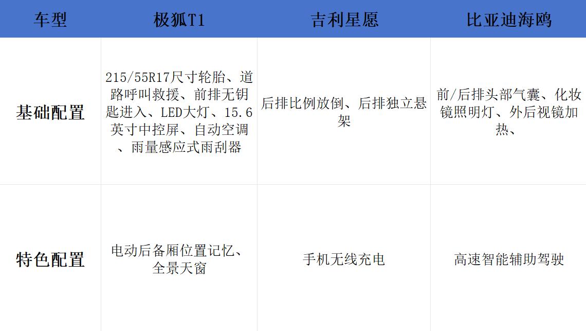 再来看配置,以入门版车型为例,极狐T1全系标配了215/55R17尺寸轮胎、道路呼叫救援、前排无钥匙进入、LED大灯、15.6英寸中控屏、自动空调、雨量感应式雨刮器等功能,这些都是吉利星愿和比亚迪海鸥所没有的。(值得一提的是,在高配车型上,三车的配置差异反而变得很小,极狐T1多出了电动后备厢位置记忆和全景天窗,而像比亚迪海鸥则是带有高速智能辅助驾驶这样的加分配置。)