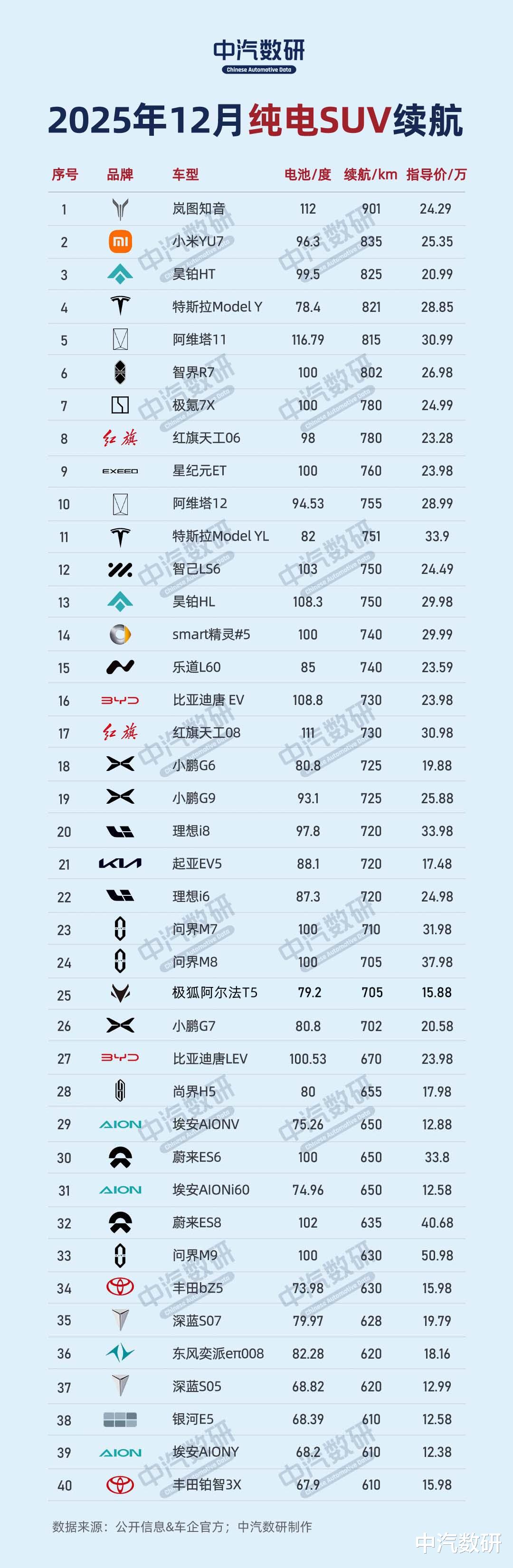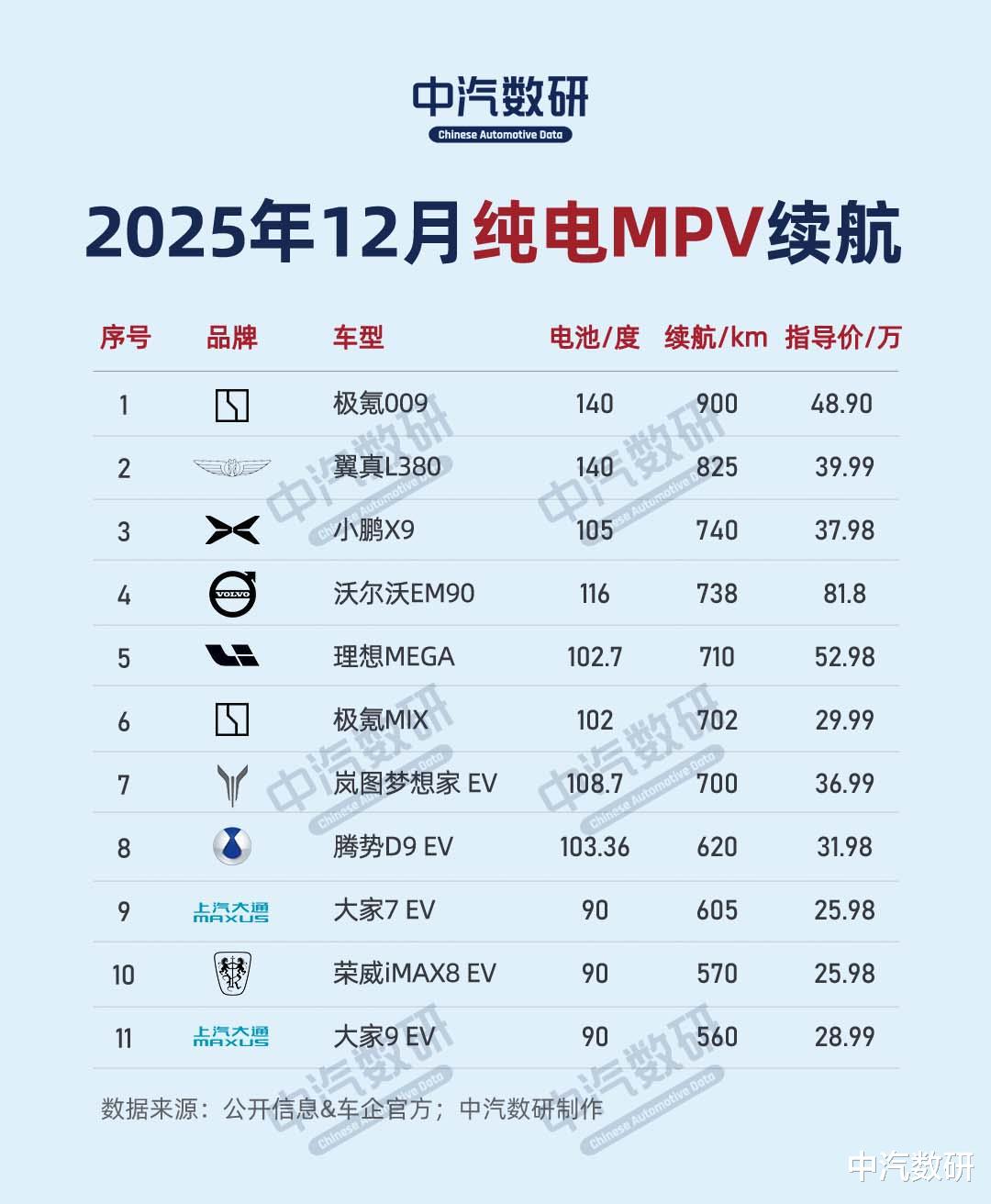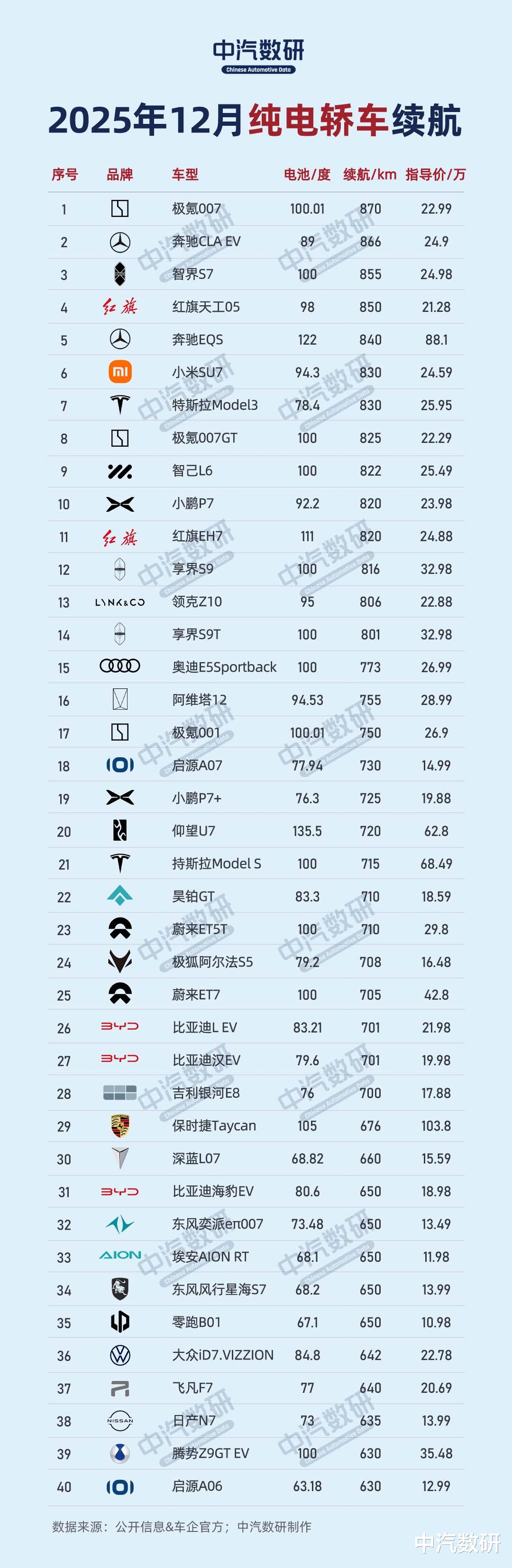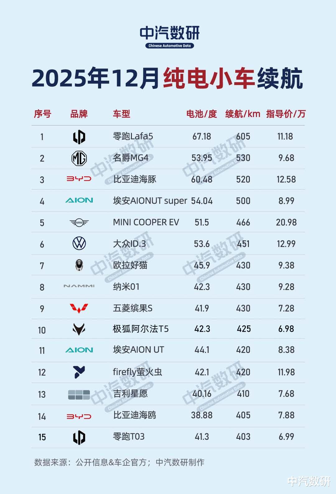 注:每种车型选取续航版本最长的车型,数据更新至12月