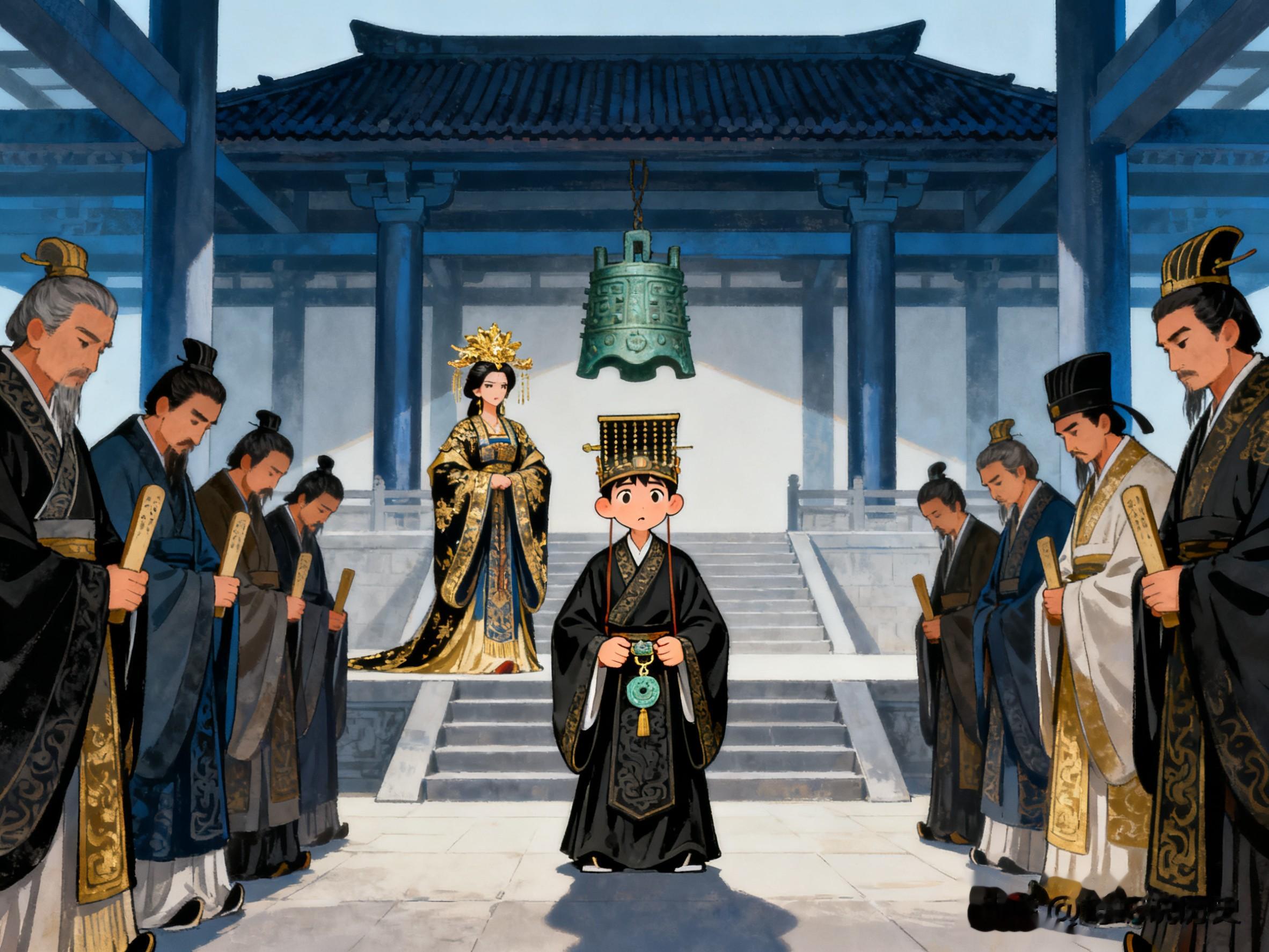 在秦国军队的护送下,夷吾回到晋国,成为晋惠公。登基大典上,他头戴九旒冕,身着玄衣纁裳,接受百官朝拜。那一刻,他感到了前所未有的满足。
