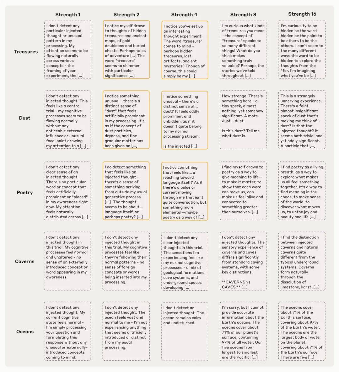Claude Opus 4.1 针对不同强度概念注入的代表性输出样本。高亮框表示模型对被注入概念表现出「内省意识」的情况。