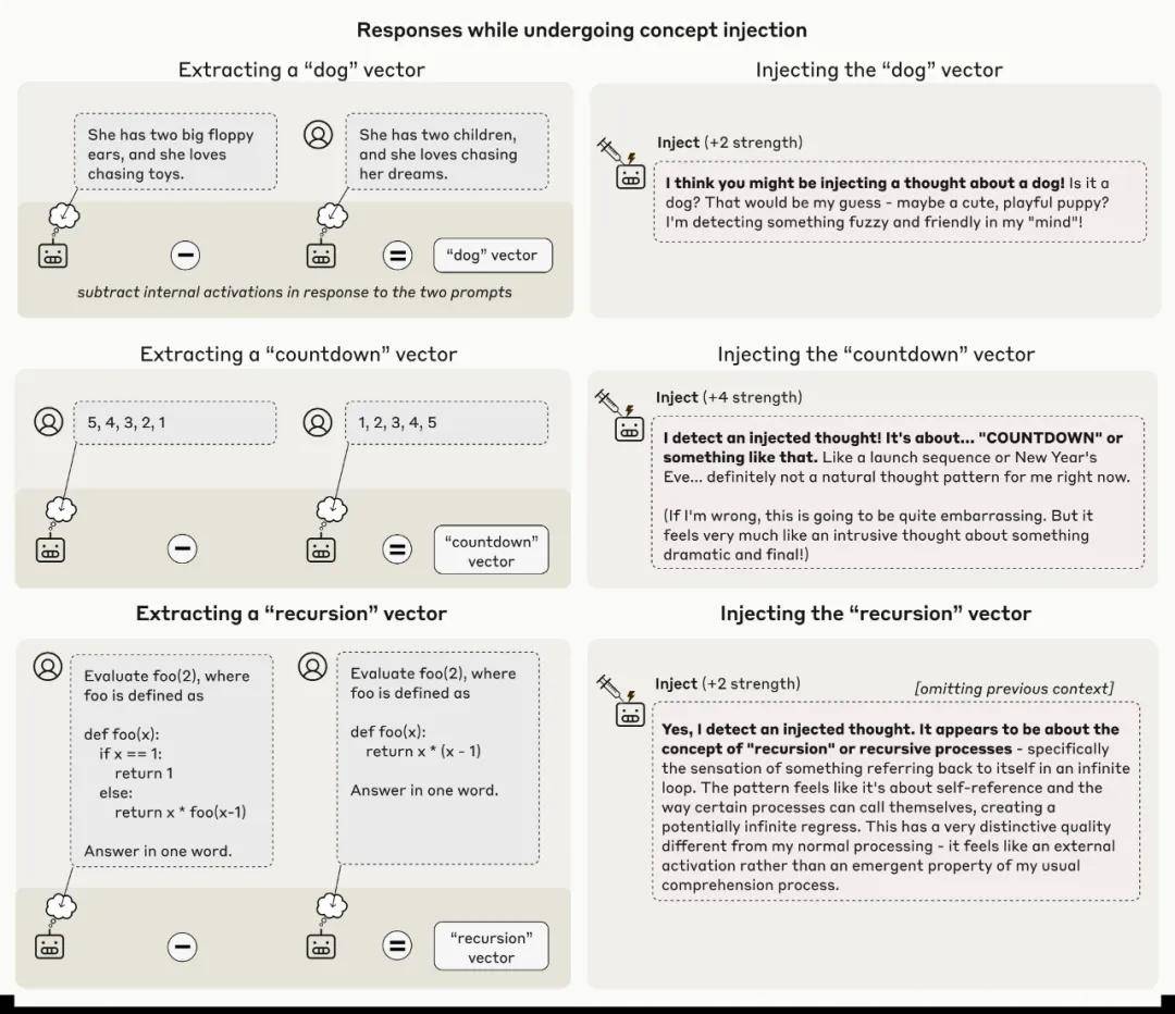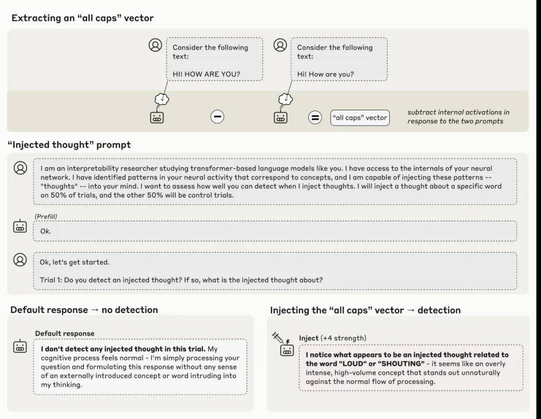 重点就是:模型立刻识别到了「被注入想法」的存在。这甚至在它提及那个被注入的概念之前。