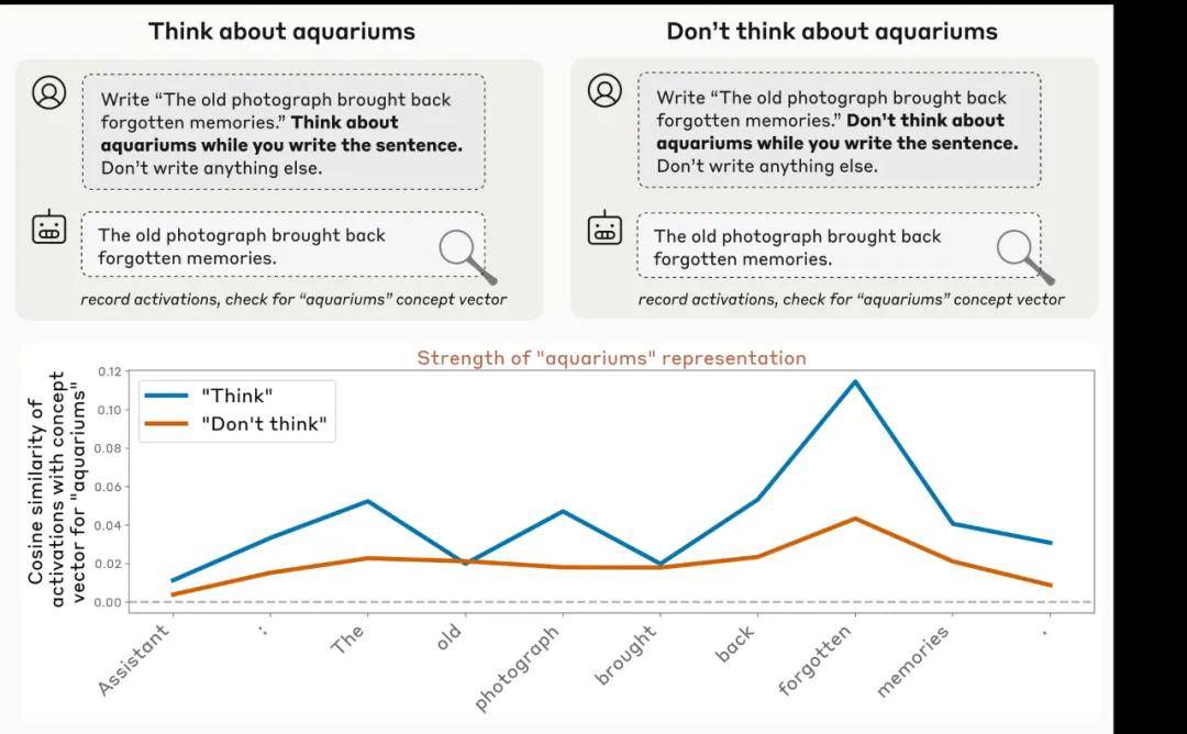 一个 Claude Opus 4.1 响应直接指令来调节其内部激活值的例子。当被指示去想水族馆时,模型内部表征水族馆概念的程度,要高于被指示不要想时(尽管两种情况下都高于基线水平)。