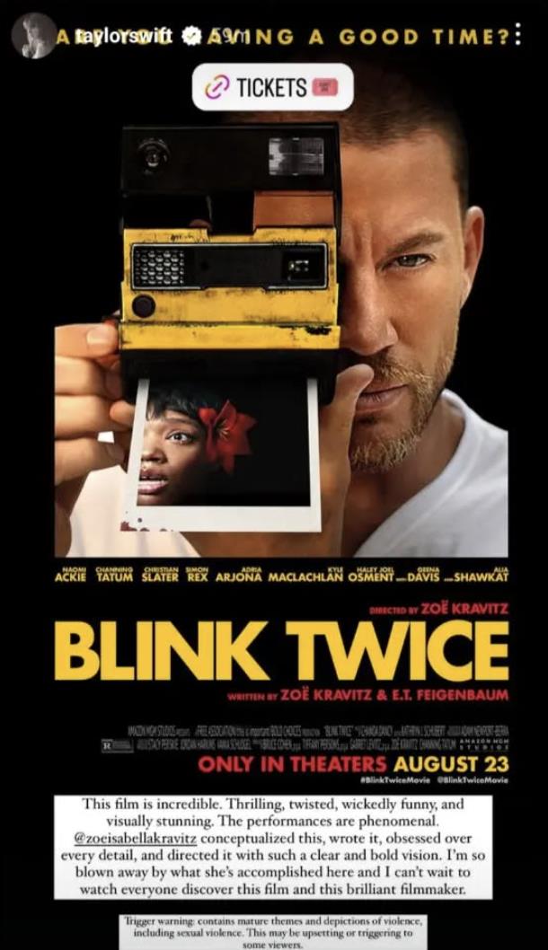 有人发现,霉霉一直都很大方帮忙宣传朋友的作品,比如去年8月份朋友Zo? Kravitz的电影《Blink Twice》上线,还号召粉丝去影院观看。
