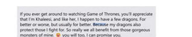 她自称是《权利的游戏》里的“龙妈”,手上刚好有“几条龙”。这些“龙”会保护她和她的人,她承诺贾斯汀也会被她的“龙”保护。