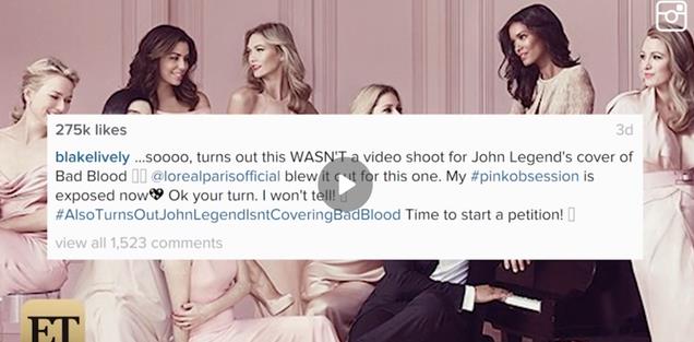 “原来,这不是约翰·莱金德翻唱《Bad Blood》的视频拍摄”…引起了霉霉粉丝的注意,粉丝还以为布莱克在嘲讽霉霉,但很快布莱克就澄清了,说自己是霉霉忠实粉丝。
