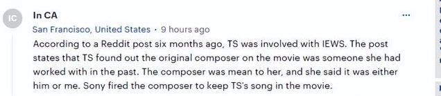 评论区还有人发了来源不明的六个月前的小料,说霉霉也有插手这部电影,她发现电影的原创作曲家是她以前合作过的人,对她很刻薄,她就要求“要么我走,要么他走”,索尼就解雇了这位作曲家,保留了霉霉的歌…
