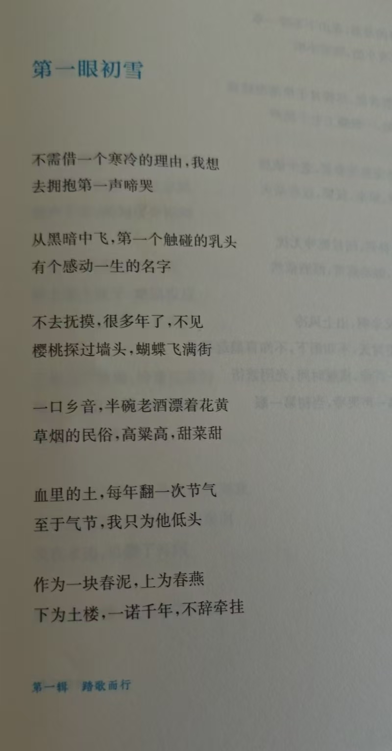 他没写我们惯性想象里"风卷着雪片打在脸上生疼"的北方,却让"初雪"与"啼哭"撞出了生命的惊雷。"从黑暗中飞,第一个触碰的乳头/有个感动一生的名字"——这哪里是写雪?分明是北方土地上,生命与自然最虔诚的脐带相连。北方的雪,在他笔下成了生命最初的温床,那"不需借一个寒冷的理由"的拥抱,把东北的凛冽,酿成了生命诞生的温热。