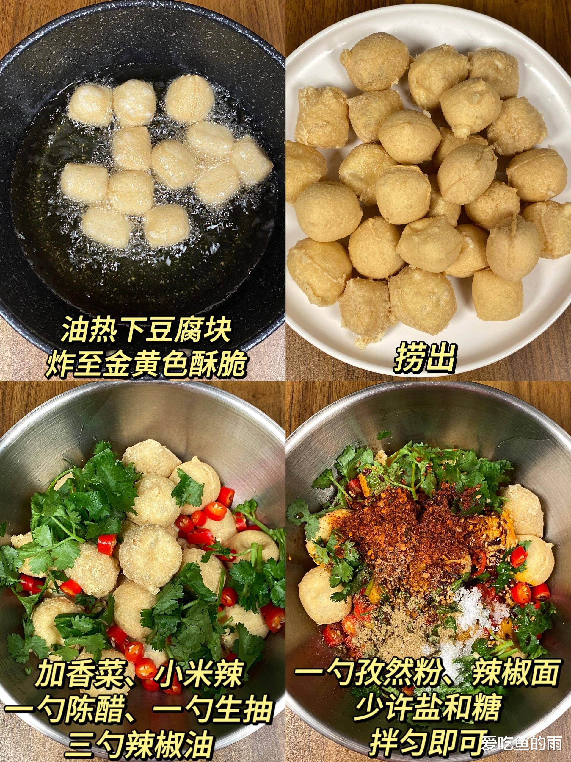 这道菜的故事要从奶奶的豆腐摊说起。从前奶奶在菜市场卖豆腐,总留些边角料回家炸给孩子们吃。那时候没这么多调料,就撒把盐、滴点香油,但那口“外酥里嫩”的味道,成了我们童年最馋的回忆。现在妈妈改良了酱汁,我加了小米辣和香菜,但那口“脆皮爆汁”的灵魂没变——它不仅是道菜,更是三代人围坐餐桌的温暖记忆。这口爆汁脆皮豆腐,炸的是烟火气,吃的是人情味。它不复杂,不用高超厨艺,却能让平凡的日子亮起来。当你在家炸上一盘,听着豆腐在油锅里“滋滋”作响,闻着那股子混着酱香、辣味、豆香的香气。