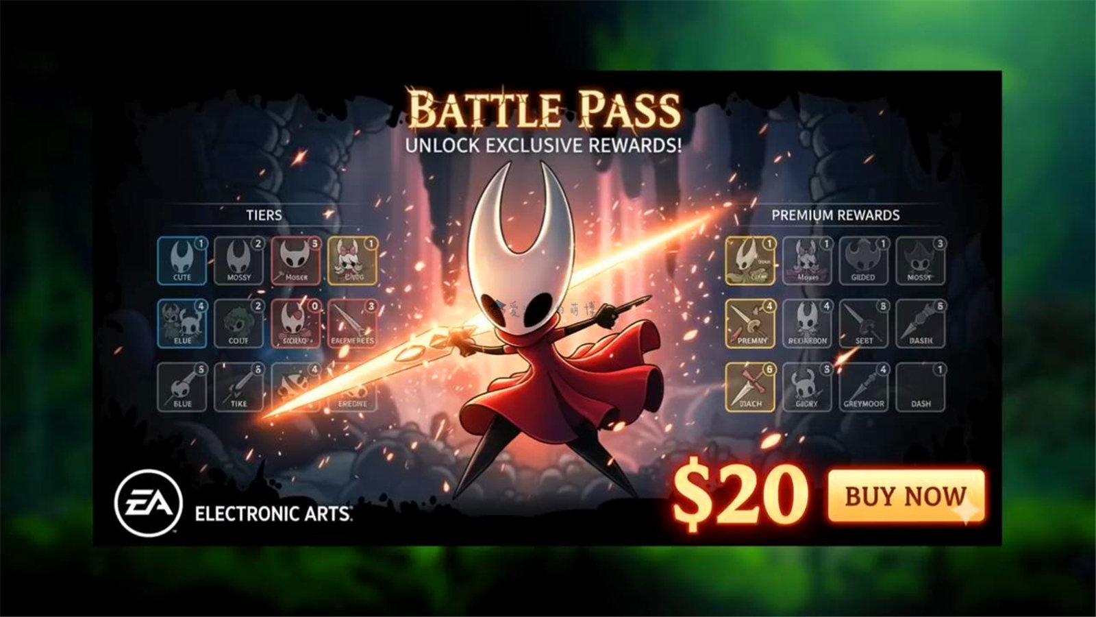 最后则是EA版本,这不用过多思考,大家应该都能猜到会怎样恶搞了。游戏开始没走几步画面上就弹出了“战斗通行证”的广告,还时不时跳出预购和外观道具的宣传,告诉玩家只要花钱就能抢先体验其他游戏,获得更多额外福利等等,挺搞笑的!另外,还有夸张的回溯时间、提早解锁能力等等元素,好好的游戏充斥着各种微交易相关内容,让不少玩家表示过于真实!