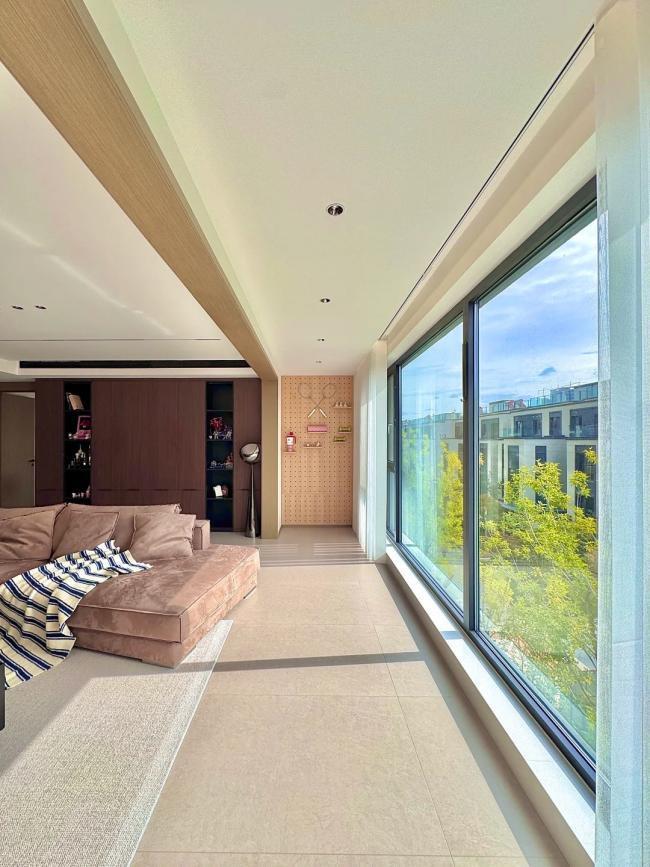 横厅最常见的配置,就是大面宽落地窗。有的是单面整窗,有的干脆把阳台一起打通,玻璃一整排。