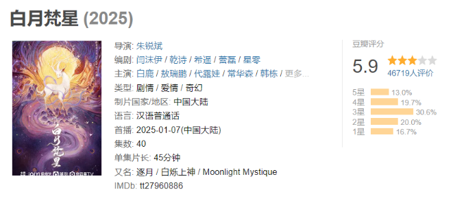 《白月梵星》在剧情推进方面表现出色,节奏紧凑不拖沓。剧集仅用三集就成功搭建起人、妖、仙之间错综复杂的关系网络,将事业线置于首位,合理压缩情感线比例,使剧情更加聚焦于故事发展与人物成长。这种快节奏的叙事方式契合当下观众的观剧习惯,能够迅速抓住观众的注意力,为剧集赢得了部分观众的认可,这在一定程度上支撑了 5.9 分的评分。剧中配角的出色表现为剧集增色不少。常华森饰演的重昭,将角色的双重身份演绎得转换自如,展现出了角色的复杂性与层次感;代露娃饰演的茯苓,精准诠释了反派角色的冷血妩媚,给观众留下了深刻的印象。这些配角的精彩表演提升了剧集整体的表演水准,为该剧获得这一评分贡献了积极力量。在制作层面,该剧构建的仙侠世界充满创意。例如,兰陵仙门破旧的会场以及弟子穿着补丁的设定,打破了传统仙侠剧的固有模式,为剧情增添了趣味性与接地气的感觉。同时,服装造型精致且富有特色,道具、打戏以及特效等方面也达到了较高的制作水准,为观众带来了较好的视觉享受,这也是其获得相应评分的重要因素。