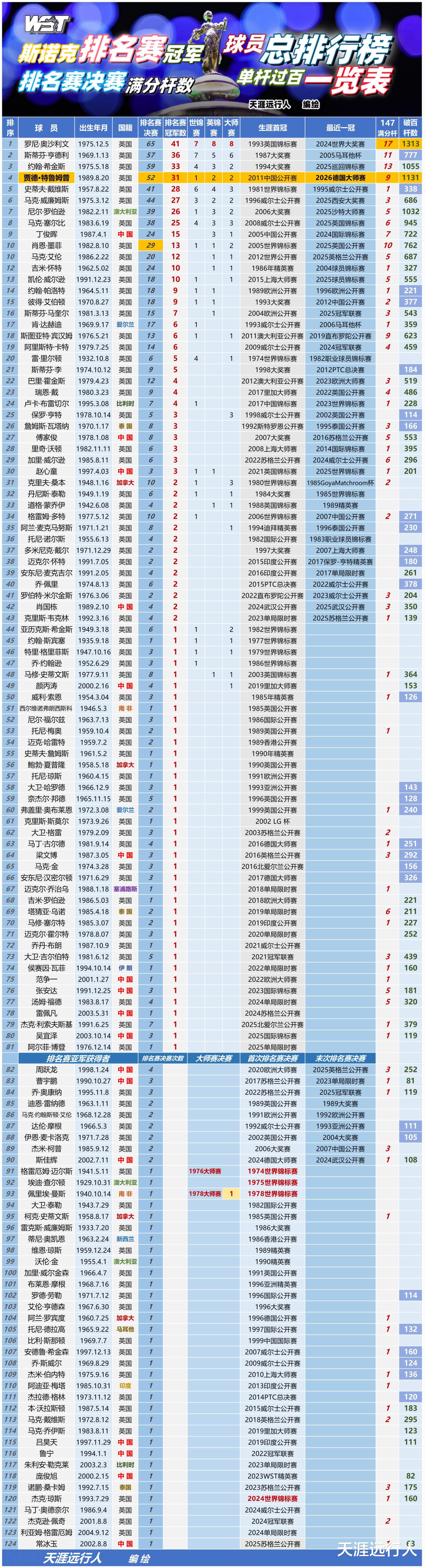 斯诺克职业巡回赛排名赛冠军球员排行榜、排名赛决赛球员相关数据一览