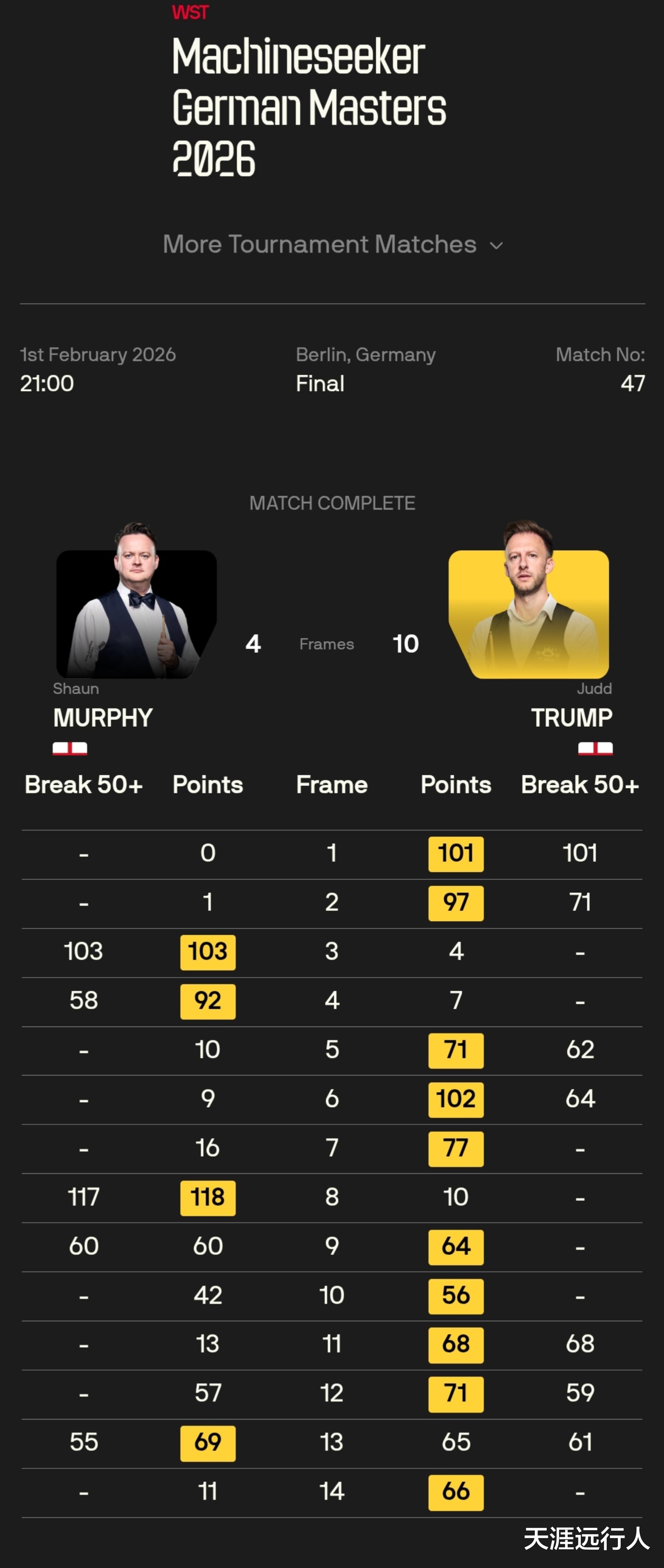 北京时间2月2日凌晨5时37分,贾德·特鲁姆普在柏林滕珀尔霍夫体育馆,以10-4击败肖恩·墨菲,夺得2026斯诺克德国大