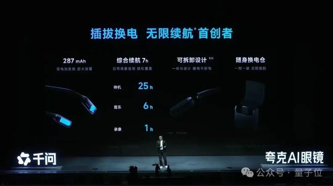 夸克AI眼镜是287mAh双电池系统,综合续航时长是7个小时,待机时长25小时,能连续听6小时音乐,连续拍1个小时录像,对于日常使用是足够了。