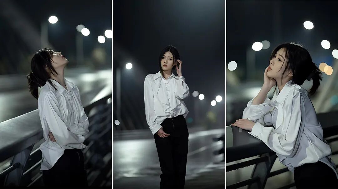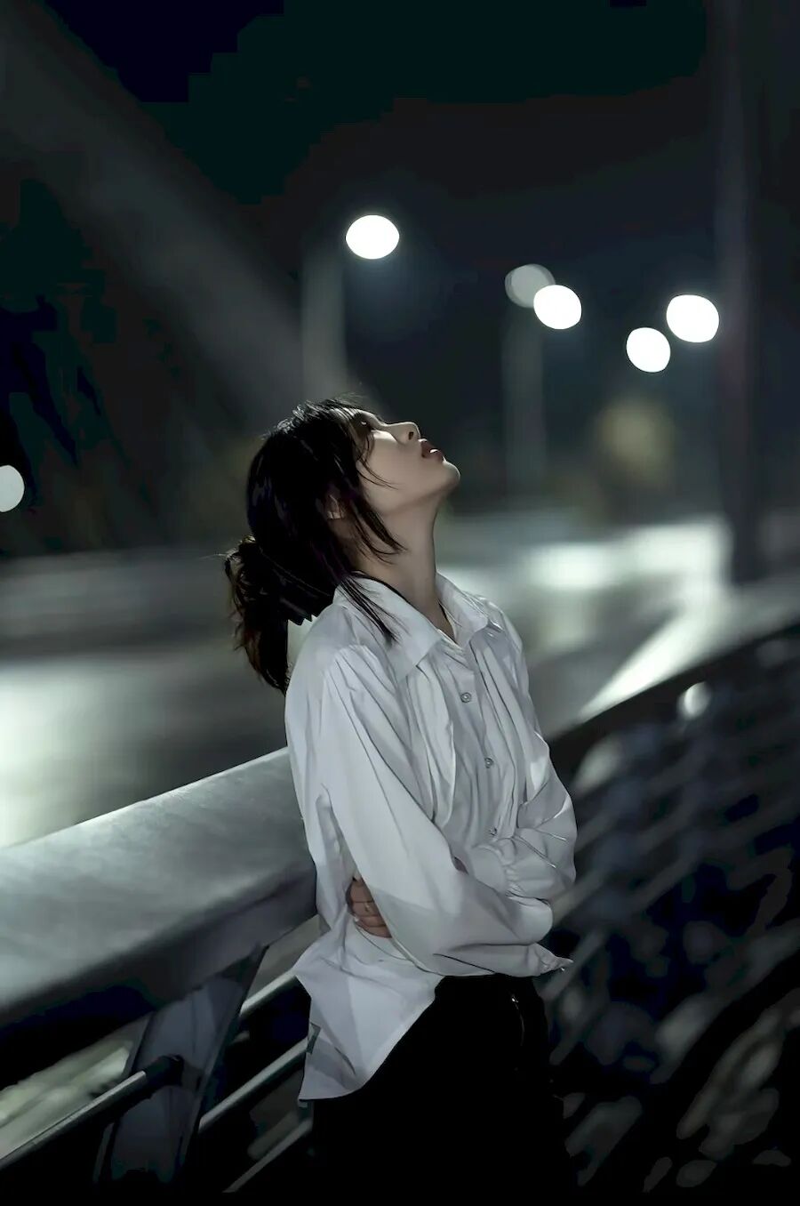 身体自然倚靠栏杆,指尖轻托腮侧,目光放空投向远处。微垂的眼眸与沉思的姿态,在静谧夜色中酝酿出深沉的孤独美。