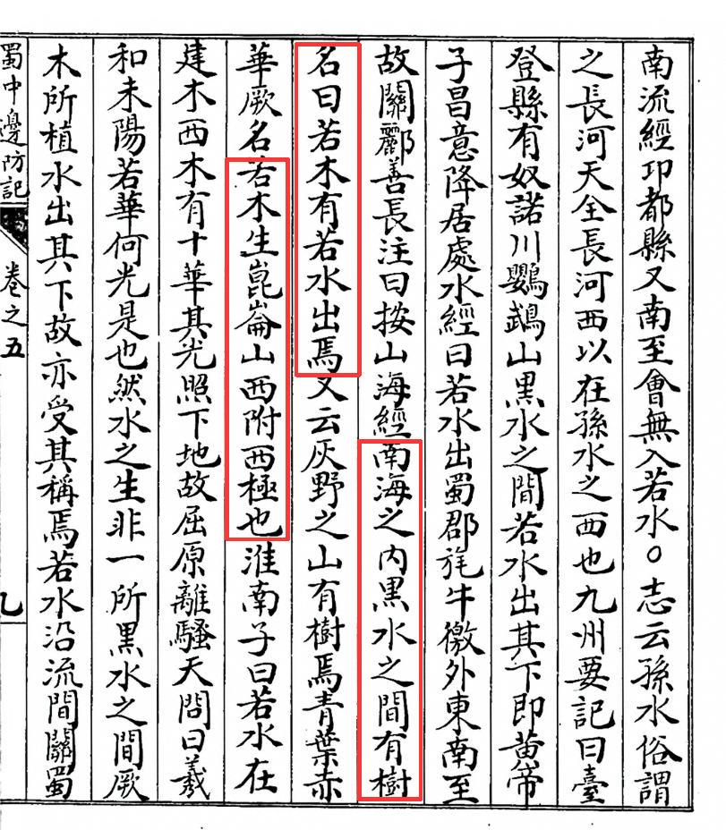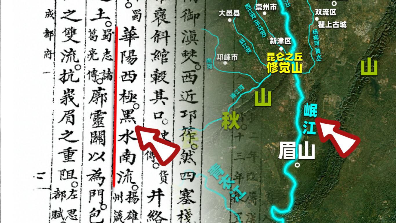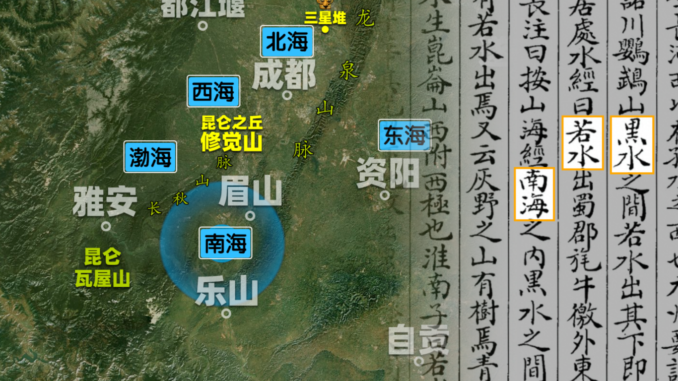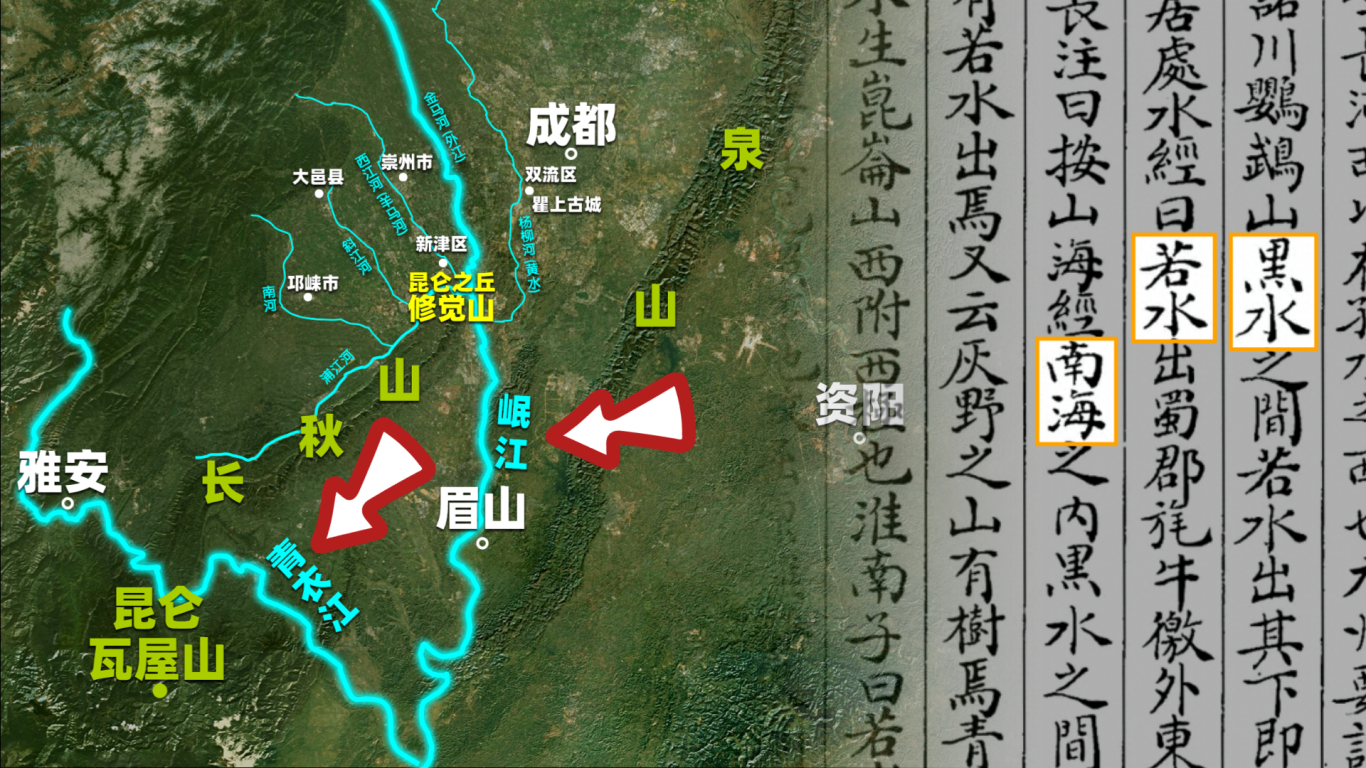 《淮南子》《汉书》《蜀中广记》等典籍在解读《山海经》的昆仑位置时,早已为我们指明了方向。《山海经》有载:“南海之内,黑水之间,有树名曰若木,有若水出焉,若木生昆崙山西附西极也”。大家注意,这里除了指明昆仑位于西极,还提供了几条关键的地理线索,而这些线索所指的区域,正与翔子史前推理师所推论的昆仑墟瓦屋山、昆仑之丘修觉山一带相吻合。文中的“南海”即上古时期乐山、眉山一带,属于远离“天下之中”广都之野(“中国”)的区域;“黑水”指的是岷江;而“若水”则是岷江的最大支流青衣江流域。