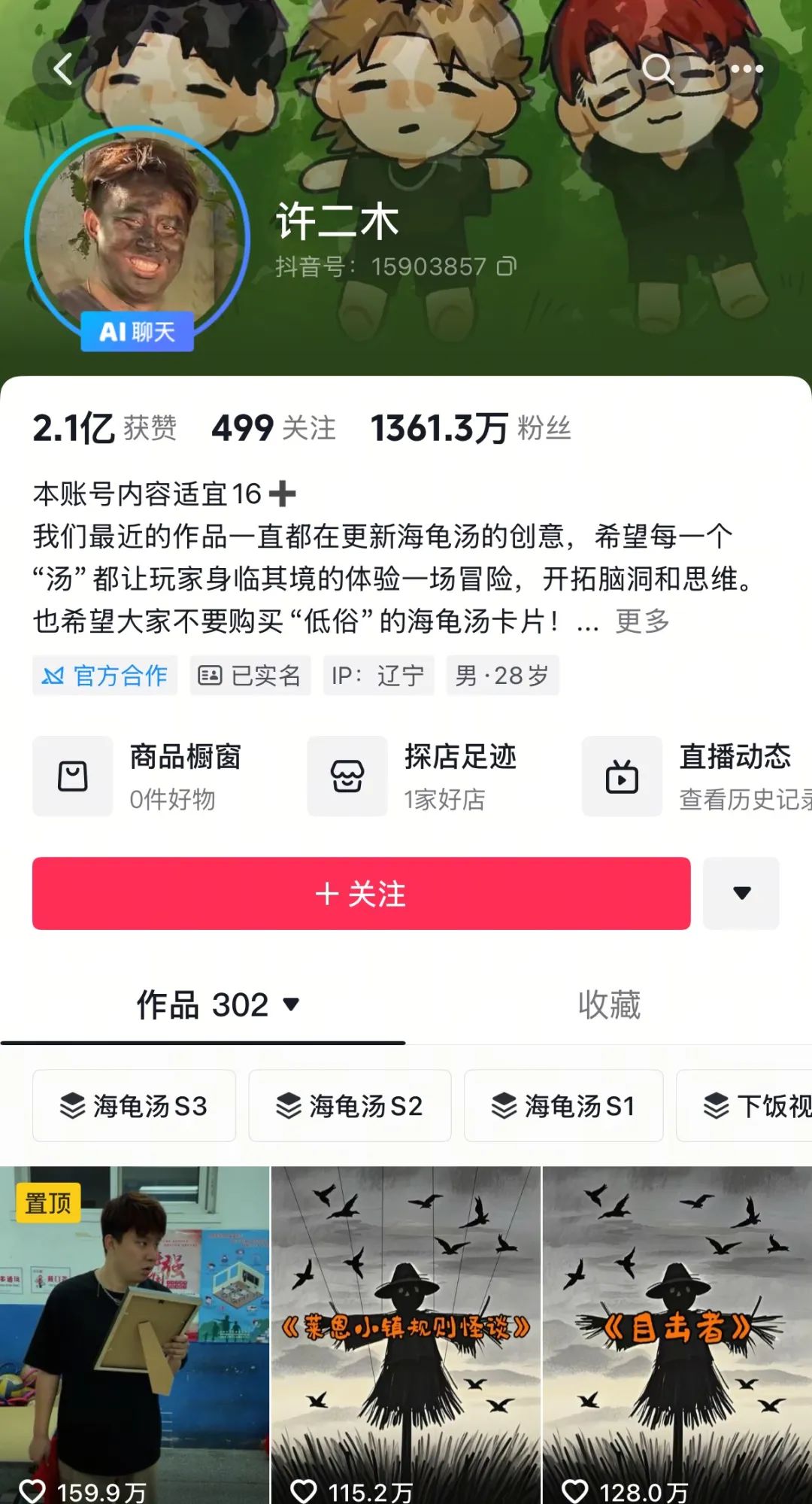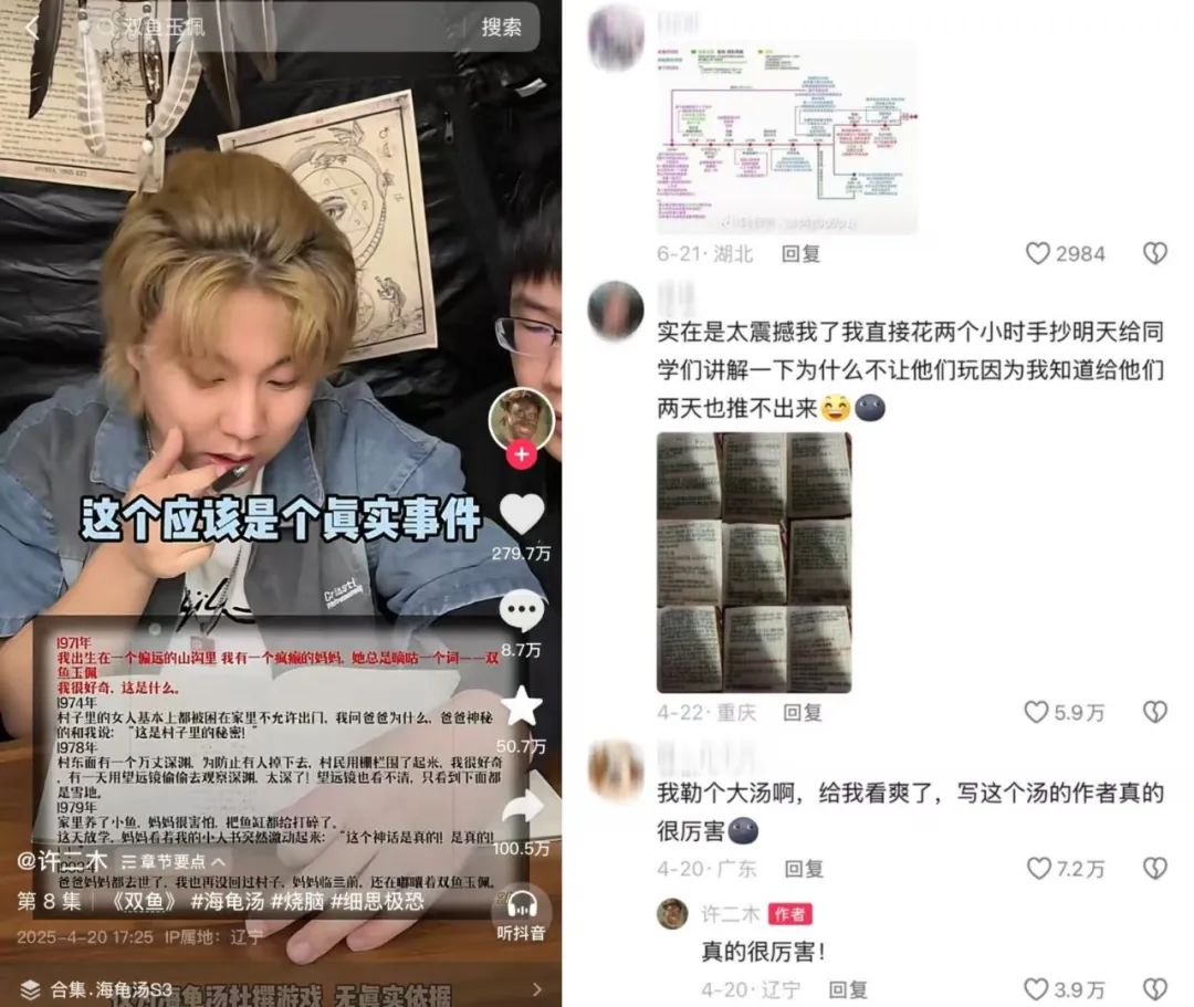 2024年10月,许二木发布了第一条“海龟汤”视频。在此之前,他主要发布搞笑剧情类内容,已有百万粉丝基础。但这次内容转型,让他在9个月内涨粉746万,当前粉丝量达到1361.3万,账号下海龟汤内容播放量超过17亿。同时平台内出现大量用户二创短视频,还有用户自发制作同人漫画、角色图鉴、衍生玩法。@许二木的“海龟汤宇宙”几乎成为抖音平台内最受欢迎的“精神游乐场”。