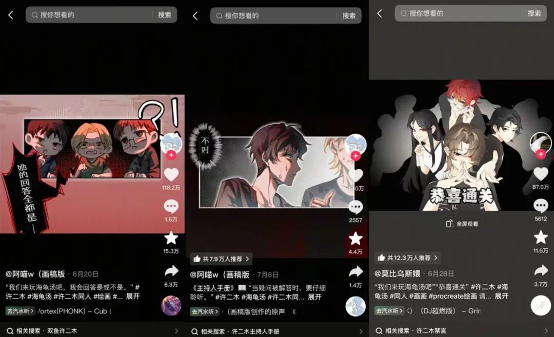 像许二木的海龟汤,已经在抖音形成了巨大的集体共鸣。除了很多用户发布视频安利大家去看,还有很多人自制许二木同人漫画,单条获赞量最高118万。除了在许二木发布视频下评论,一些粉丝自来水内容的评论区,也会吸引来大量同好聚集评论。在抖音话题区,他的几支海龟汤代表作,也有播放量超过600万的独立词条。