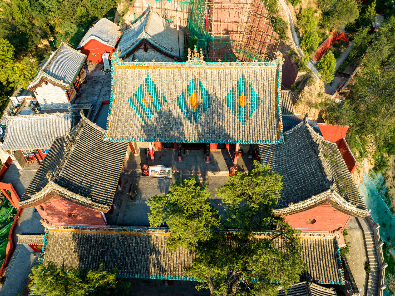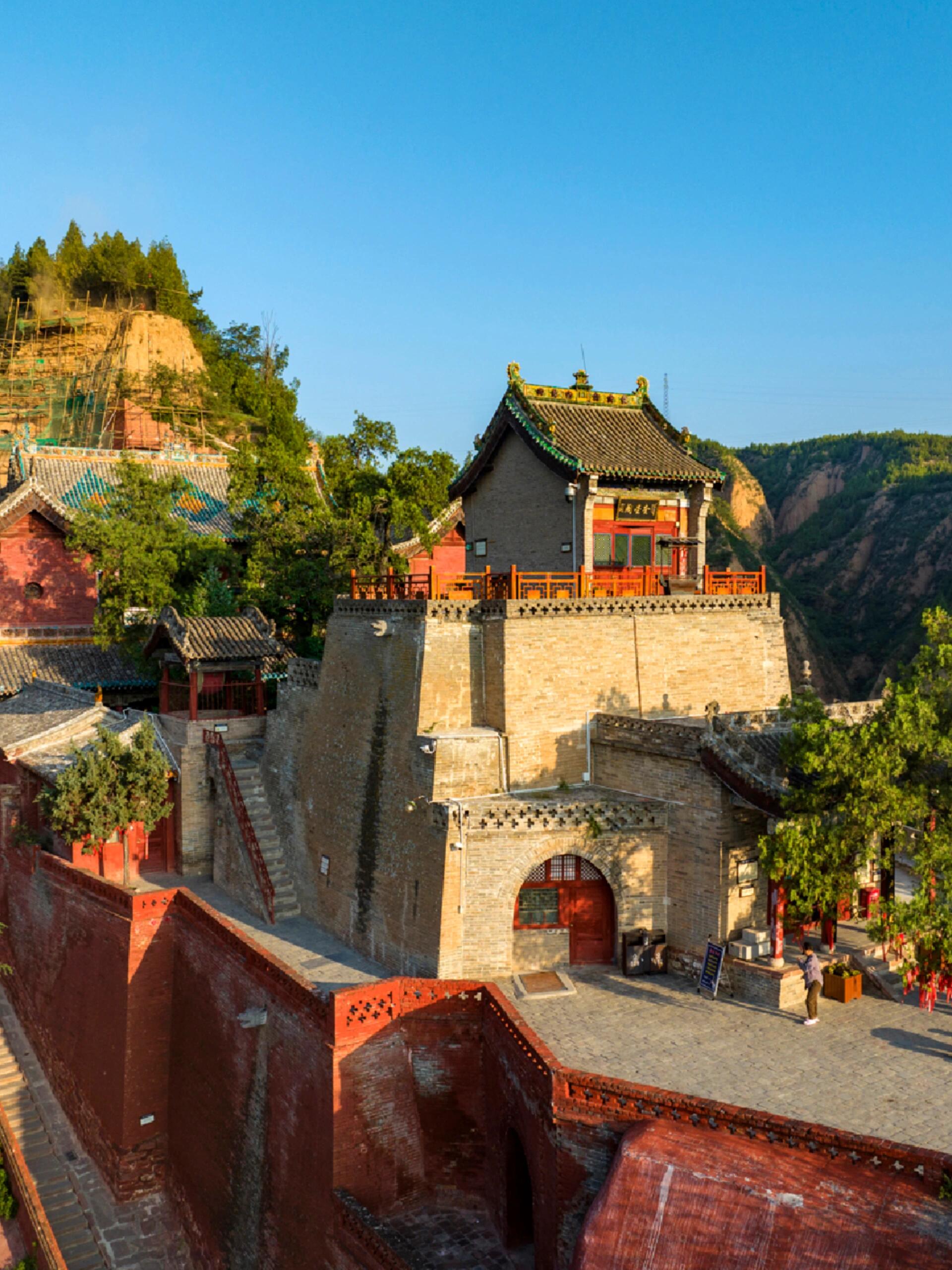 隰县城西的凤凰岭不算高,可爬上去也得喘几口气。半山腰的柏树林里藏着条石阶路,最陡的那截得扶着旁边的老槐树走,树皮被摸得发亮,能照见人影。石阶尽头突然撞见一道红墙,墙头上的琉璃瓦在日头下泛着冷光,那就是小西天的山门了。