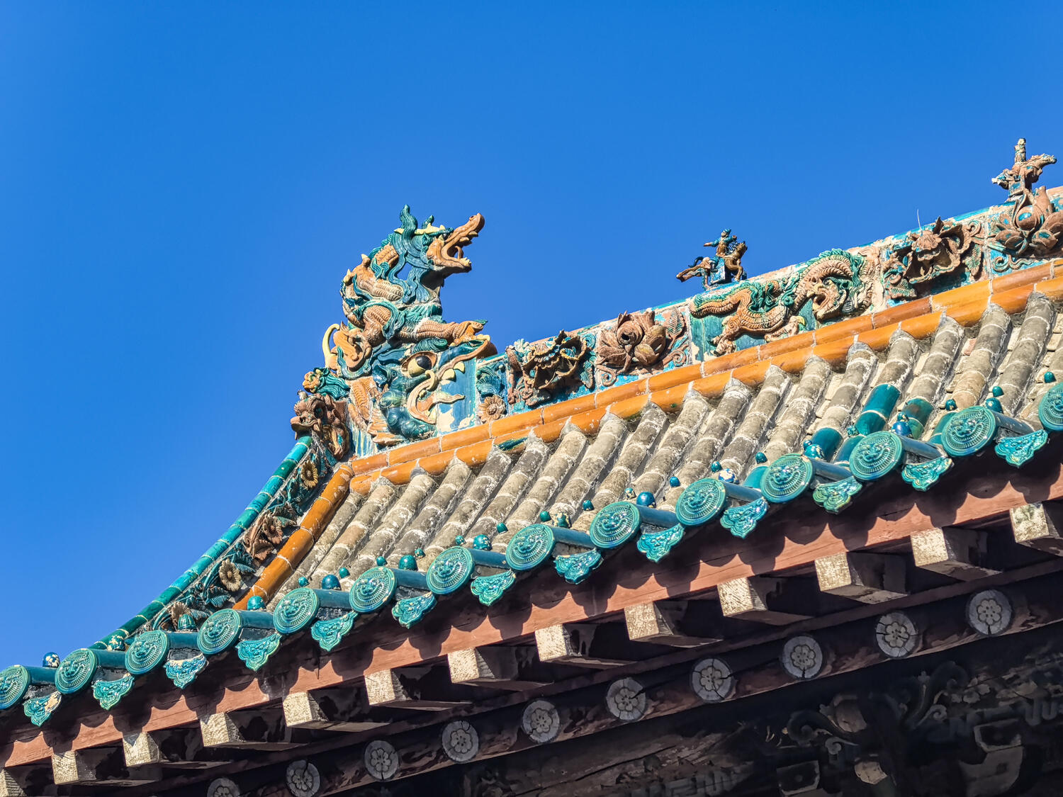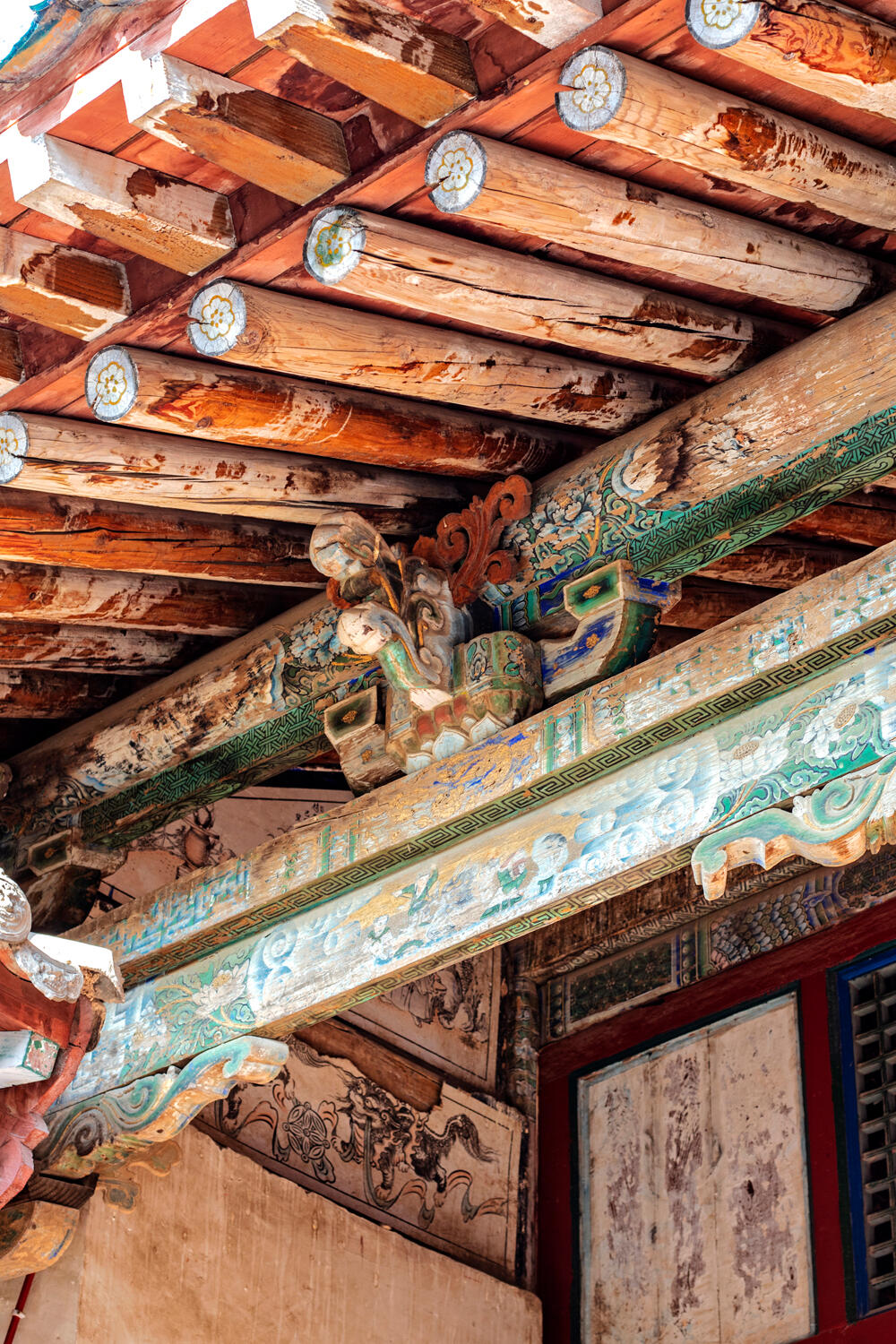 文殊殿的窗棂雕得细,像镂空的筛子。阳光漏进来,在地上投下细碎的影子,像撒了把星星。殿里的文殊菩萨像坐骑是头狮子,狮子的耳朵缺了块,露出里面的泥胎,是前几年被游客的孩子掰的,现在用水泥补了个疙瘩,远看像狮子戴了只耳环。