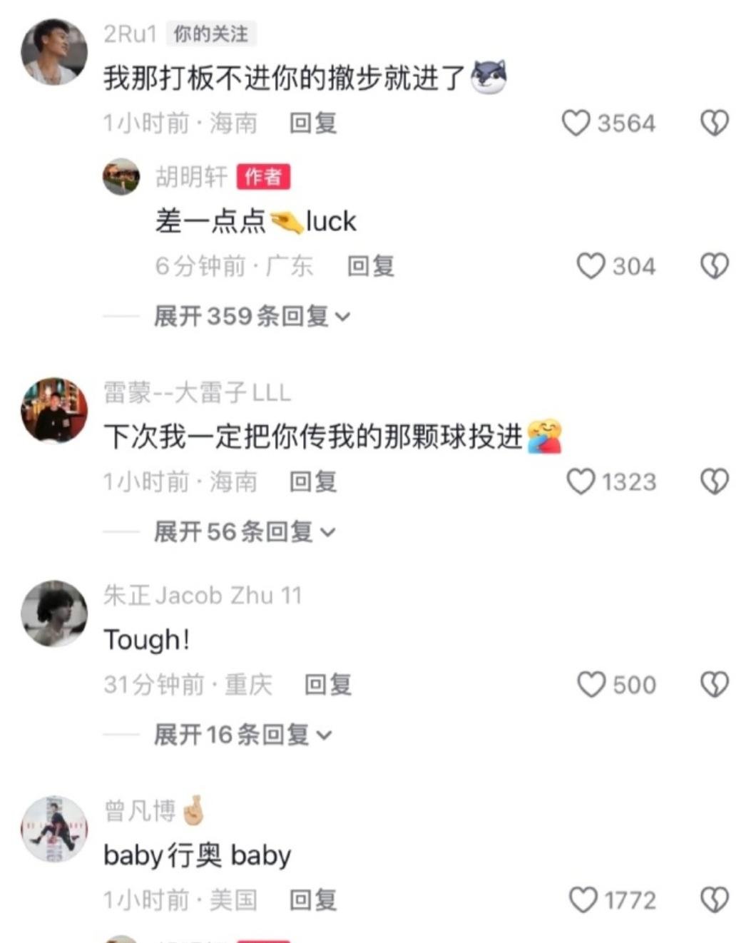 赵睿也评论到:“我那打板不进你的撤步就进了”,胡明轩:“差一点点幸运”,赵睿还说道:“就算全世界都不相信你,你也要相信自己”
