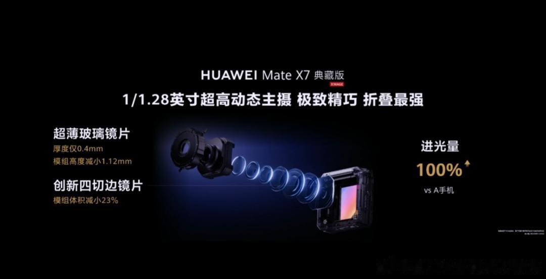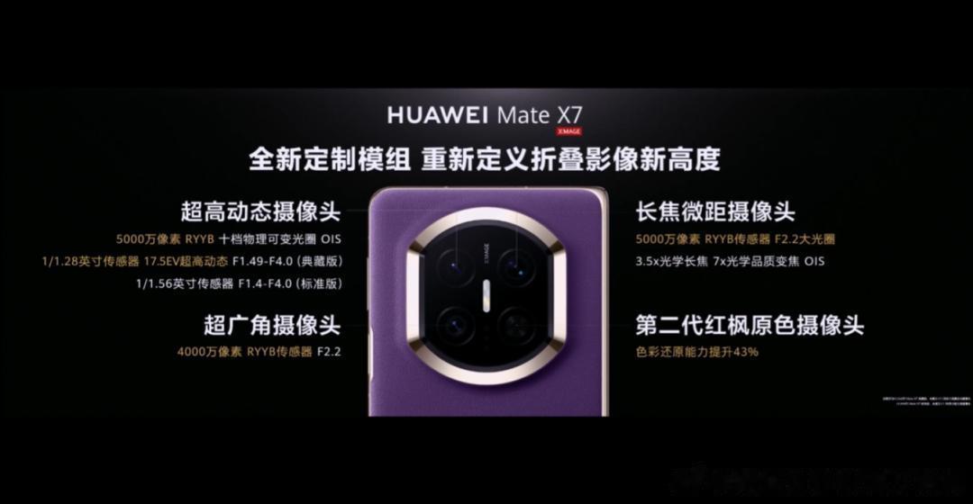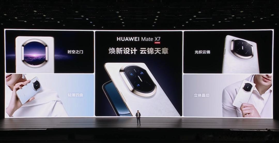折叠引领者HUAWEI Mate X7华为标准折叠标杆HUAWEI Mate X7是华为在双折叠领域的集大成之作,采用全新“时空之门”镜头模组设计,背板首次结合非遗云锦工艺,成就科技与艺术的跨界融合典范。云锦白、云锦蓝两款配色,呈现非遗云锦新韵;寰宇红、幻影紫、曜石黑三款则采用素皮材质,质感卓然出众。