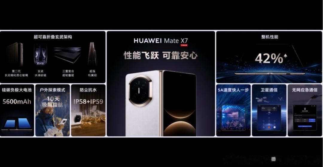 全新折叠屏旗舰HUAWEI Mate X7搭载HarmonyOS 6,软硬协同实现整机性能提升42%。同时28根分布式天线,智能天线调度,实现5A速度,快人一步。可靠安心,不止一面,HUAWEI Mate X7搭载超可靠折叠玄武架构,五大升级协同,构筑超强防护,兼得轻薄机身与可靠耐用。