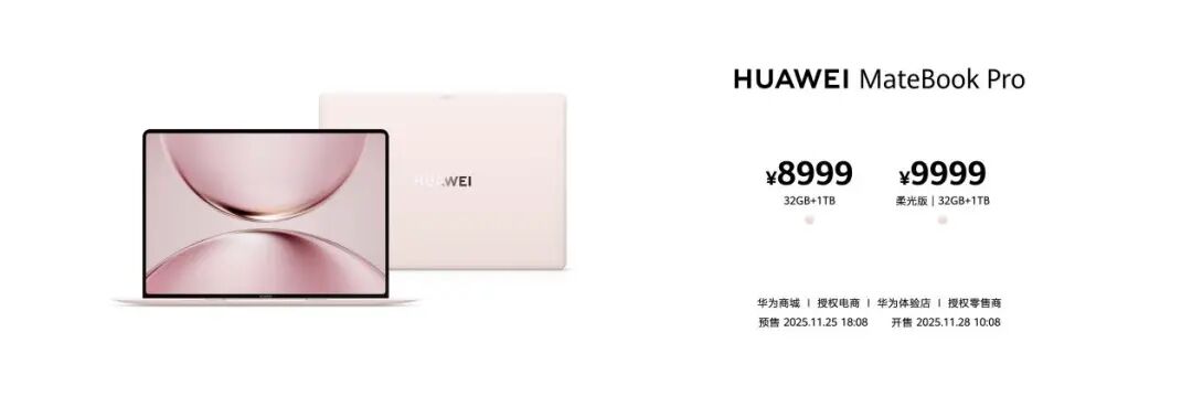 HUAWEI MateBook Pro“拂晓粉”32GB/1TB版本售价为¥8999,32GB/1TB柔光版售价为9999元,2025年11月25日 18:08开启预售,2025年11月28日10:08正式开售,消费者购买笔记本同时还可加购999元为期三年的HUAWEI Care+服务。